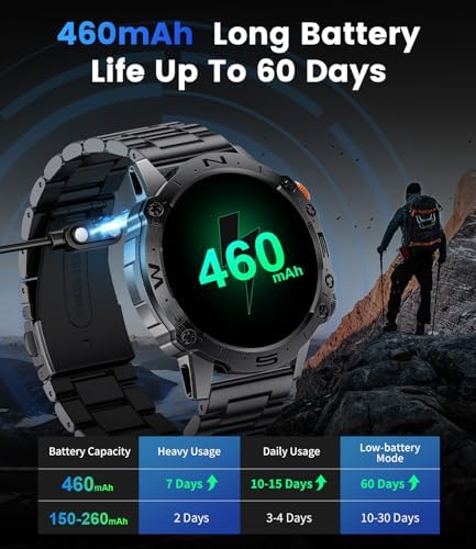 π12 MILITARY STANDARDS AND 5ATM WATERPROOF-This military smart watches for men features a 3rd generation Corning Gorilla Glass screen with a remarkable 9H hardness, effectively shielding it from screen breakage. Its robust zinc alloy case, corrosion-resistant 304 stainless steel band, and fully enclosed 5ATM waterproof design guarantee reliability in the face of extreme environments. With energy-efficient AMOLED technology and a sizable 460mAh battery, it offers an impressive 7-15 days of usage and an extended battery life of up to 60 days.