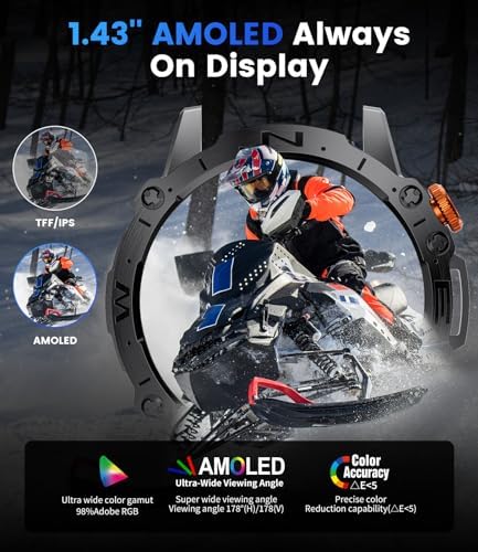 π WHY AMOLED SCREEN- ESFOE smart watches for men is equipped with a 1.43-inch AMOLED round display with a resolution of up to 466×466 and 100% RGB color gamut coverage, which will be more power-efficient than traditional LCD screens, and the colors are more vibrant (and clear outdoors). This smart watch also supports unique features such as “Always On Display”, “Wake on Wrist Lift” and “Security Lock Screen”.