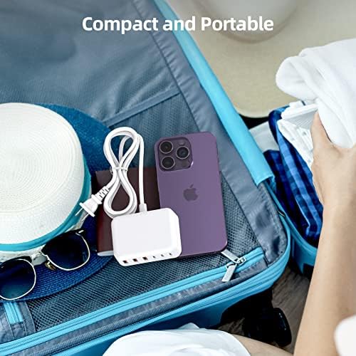 ⚡【Compact and Portable】Multiport USB C Charger Station perfectly charges multiple devices for home, office and travel. Small size saves you 50% space and fits easily into pockets, handbags, travel cases. The design with 5FT AC extension cable allows you to charge as you want without worrying about the limitation of distance.