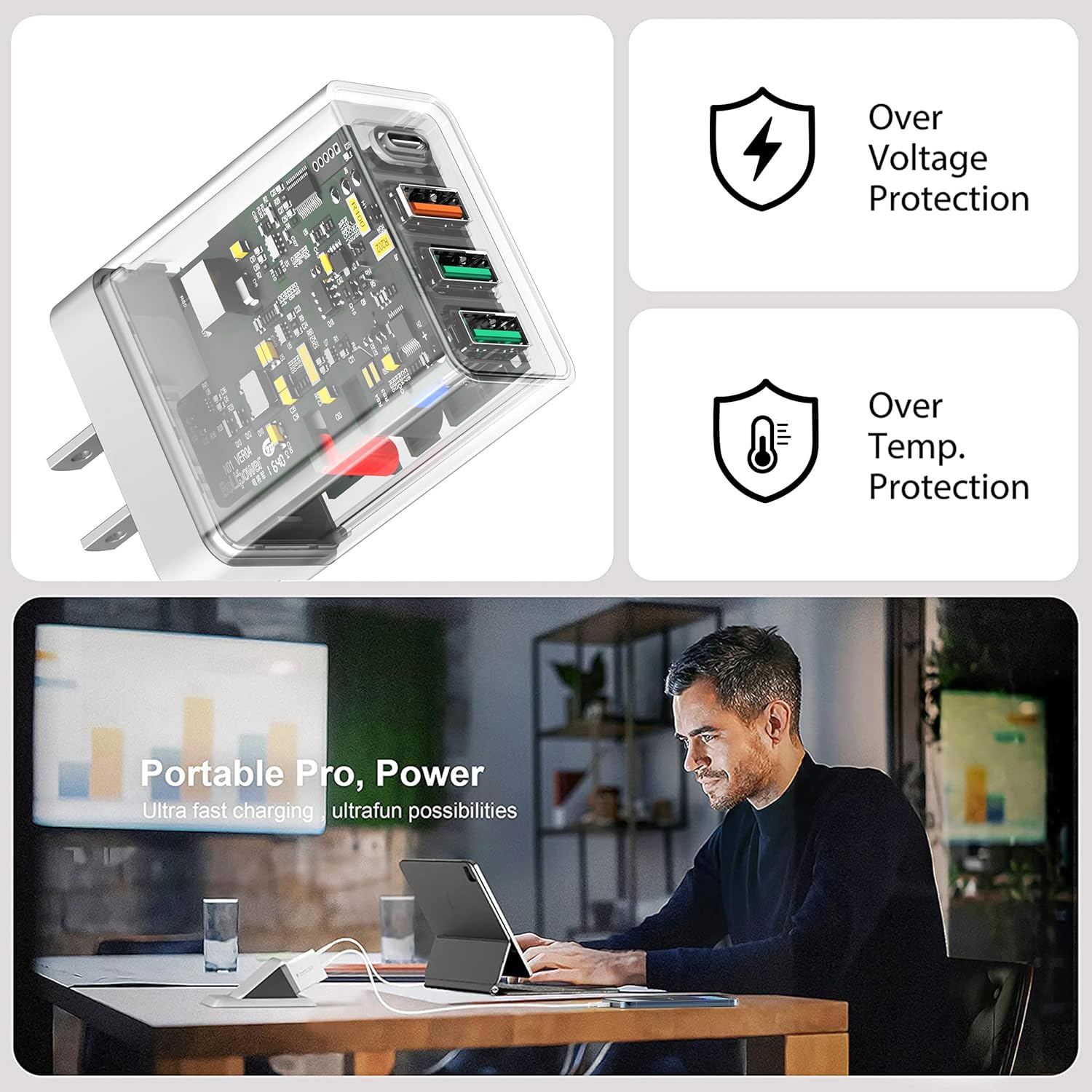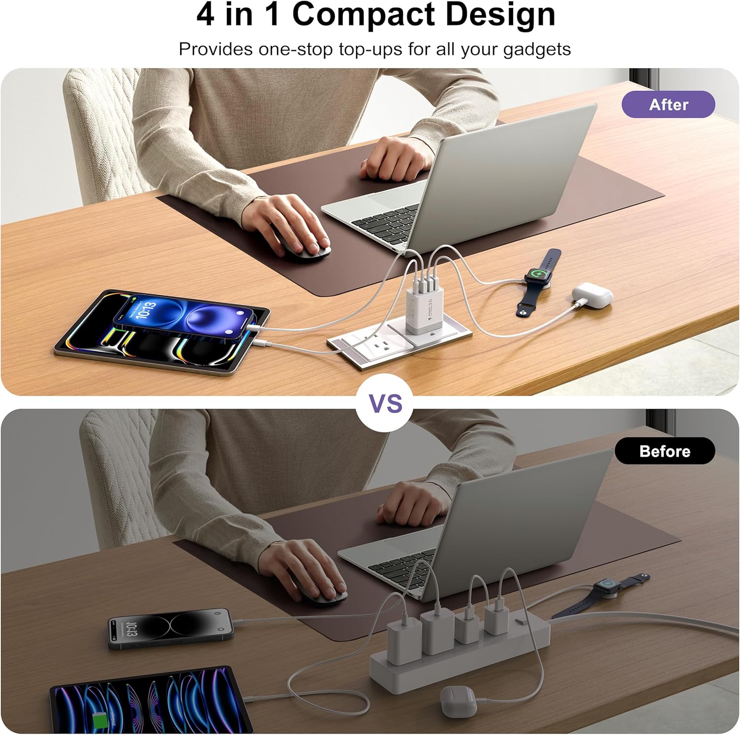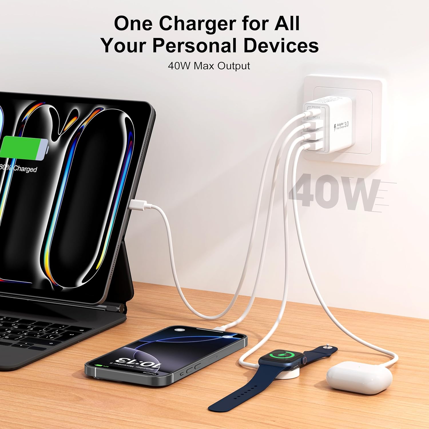 2-Pack Four Port Charger: Compatible with iPhone 16/16 Pro/16 Pro Max/16 Plus/15/15 Pro/ 15 Pro Max/15 Plus/14/13/iPhone 13 Pro Max/iPhone 13 Pro. One for all – with totally 40W 4-Port designed (1X USB-C + 3X USB-A), allow users to simultaneously charge four devices.Minimize waiting time and frees you from messy chargers with various interfaces