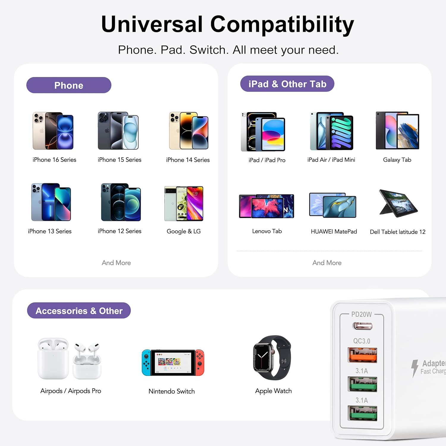 iPhones iPhone 16/16 Pro/16 Pro Max/16 Plus/15/15 Pro/ 15 Pro Max/15 Plus, iPhone 14/14 Plus/14 Pro/14 Pro Max, iPhone 13/13 Mini/13 Pro/13 Pro Max, iPhone12/12 Mini/12 Pro/12 Pro Max, iPhone 11/11 Pro/11 Pro Max, iPhone SE 1/2, iPhone X/XR/XS/XS Max, iPhone 8/8 Plus, iPhone 7/7 Plus, iPhone 6/6S/6S Plus Apple Accessories AirPods 1/2/3/4/Pro/Max, MagSafe Charger, Apple Watch Series Ultra2/Ultra/SE2/SE/8/7/6/5/4/3/2/1/iPod touch 5/6/7, iPod nano 7 iPads iPad Pro 12.9″ 1/2/3/4/5/6, iPad Pro 11″ 1/2/3/4, iPad Pro 10.5″/9.7″, iPad Air 1/2/3/4/5, iPad Mini 1/2/3/4/5/6, iPad 4/5/6/7/8/9/10 Samsungs Samsung Galaxy S24/S24+/S24 Ultra/S23/S23+/S23 Ultra/S22 Ultra/S22+/S22/S21 FE/S21 Ultra/S21+/S21/S20 Ultra/S20+/S20 FE/S20 Lite/S20/Note 20/Note 20 Ultra/Note10+/S10/S10e/S10+/S9/S9+/S8/S8+/Note 9/Note 8/A73/A72/A53/A52/A33/A32/A03 and more Series Android Phones Moto G82, Moto E32, Moto G Stylus(2022), Moto Tab G70, Moto G71 5G, G41, G40 Fusion G31, G Power(2022), G51, G51 5G, G50 5G, G60s, G20, G100, E30, E40, E20, E7i Power, E7 PowerEdge S30, X30, G200 5G, Edge (2021), 20 Fusion, 20 Pro, 20, 20 Lite, Google Pixel 5/4XL/4/3XL/3/2XL/2/XL, Nexus 5X/ 6P, Sony XZ2 Premium/Sony XZ3/Moto edge S30/X30/S Series/HUAWEI Mate/P/Nova Seriesand more Other Accessories Wireless Chargers, Wireless Earbuds, Smartwatch, Switch and more USB C devices. Tablets Samsung Tab A8/A7/S8+/S8/S7+/S7/S7 FE/S6/S5/S5e/S4/S3; Lenovo Tab M10 / P10 / M8 / V7 / E10 / E7, Google Pixel Slate 12.3”, Fire HD 10/ Fire HD 8/ Fire, Kindle etc.Samsung Tab A / 4 / S6 / S5 / S5e / S4 / S3; Lenovo Tab M10 / P10 / M8 / V7 / E10 / E7, Google Pixel Slate 12.3”, Fire HD 10/ Fire HD 8/ Fire, Kindle etc. Specification Input: 100-240V, 50-60Hz 0.6A Output:20W 5V/3A, 9V/2.22A, 12V/1.66A Total 40W Max
