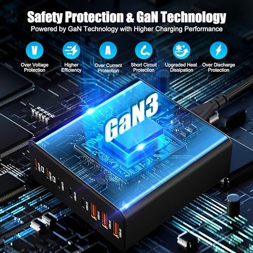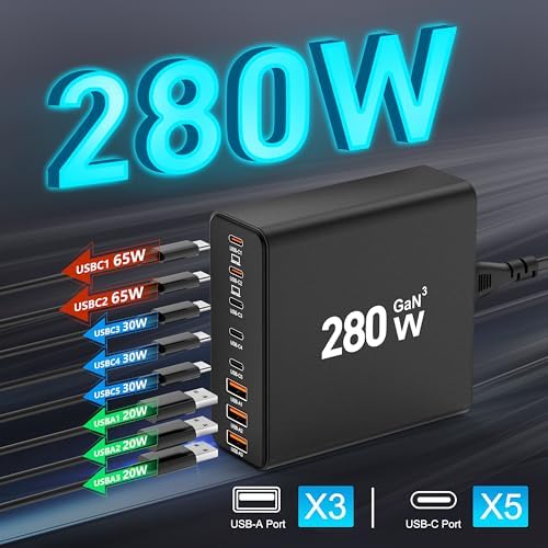 8-in-1, With 5*USB C ports and 3*USB A ports(total 280W), no need for more adapters, you can use just one outlet to plug in laptops, tablets, smartphones, Bluetooth speakers and other small gadgets like earbuds, smartwatches, game consoles etc.The Upgraded PD 65W Laptops Charger can charge two laptops at the same time.Fast Charging GaN Charger,Our fast charging blocks is powered by PI’s latest GaN III chip sorcery – think smaller, cooler, and faster charging.