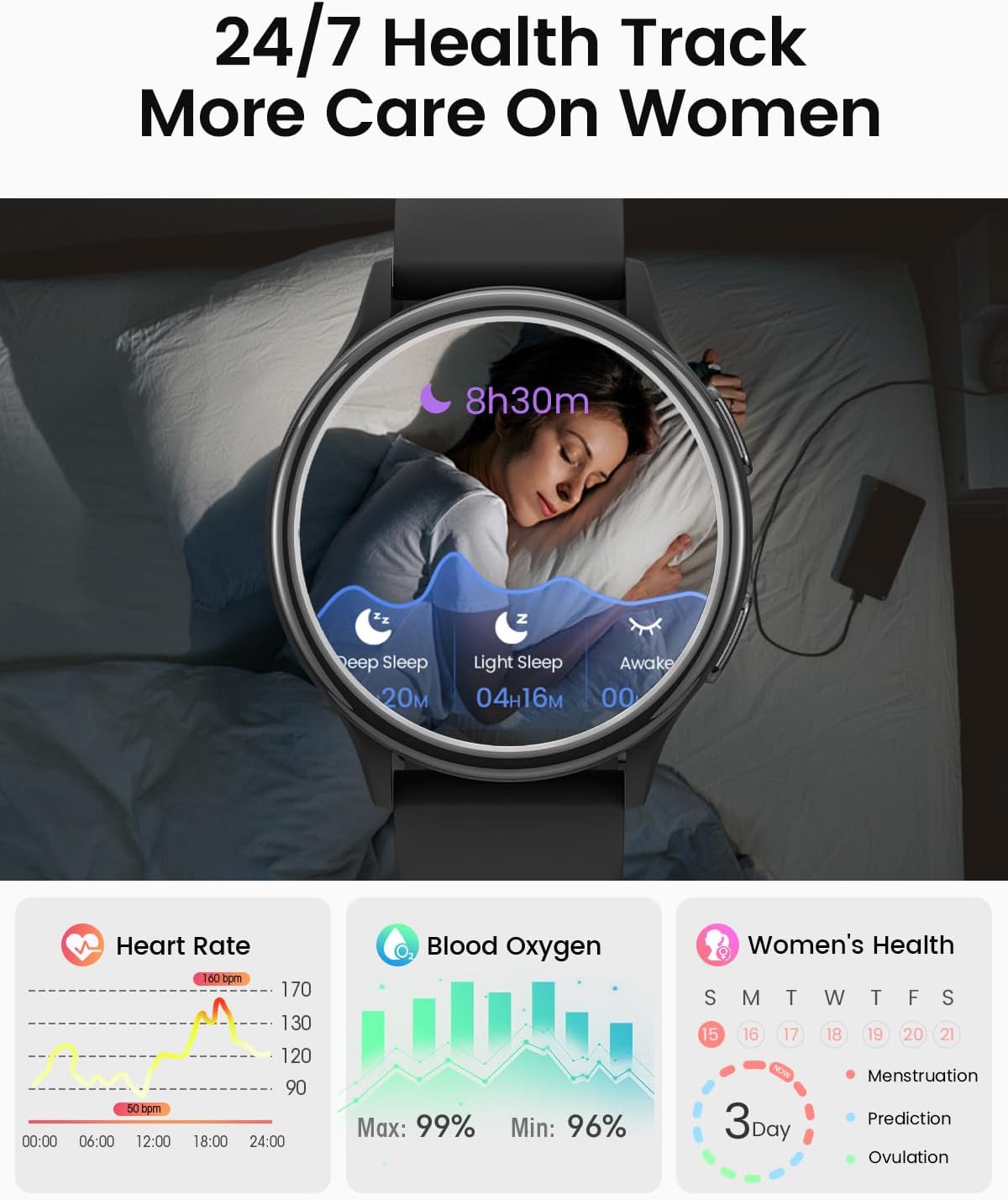 【24/7 Health Monitoring & Personalized Women’s Care】: Smart watches for women is your personal wellness companion, beautifully designed for women. With a cutting-edge AI smart chip, it tracks your health around the clock—monitoring your sleep, heart rate, calorie burn, and blood oxygen levels. It goes further with dedicated women’s health reminders, from menstrual cycle tracking to ovulation and pregnancy monitoring, ensuring that you receive the most thoughtful care every day.