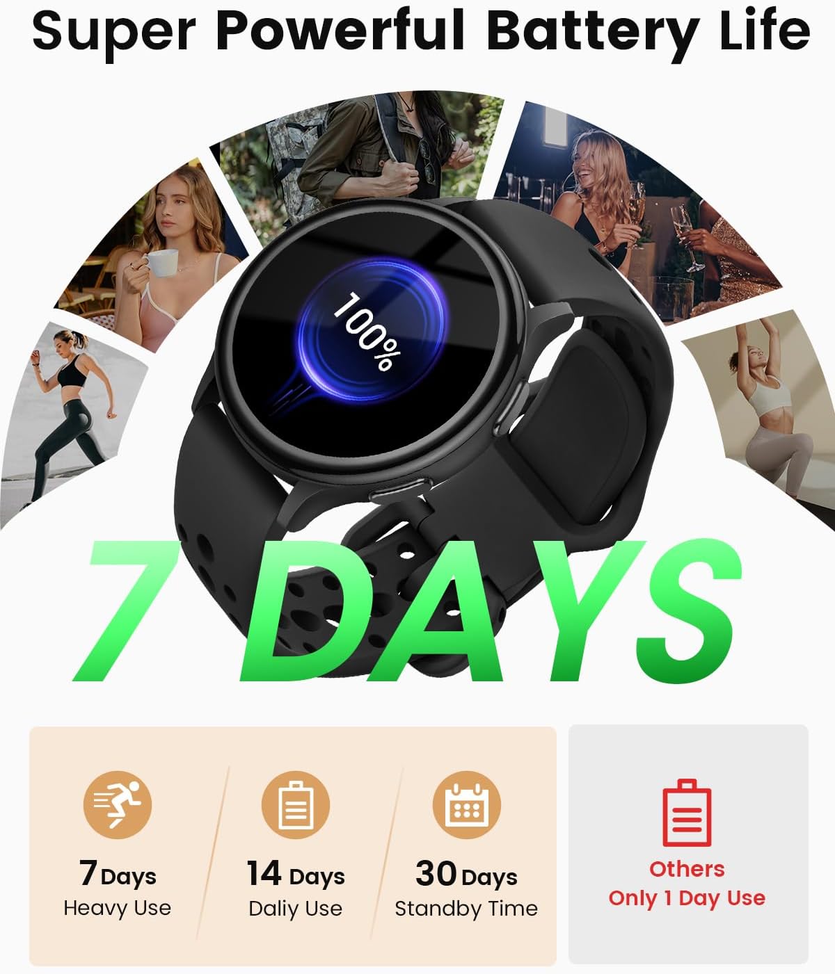 【Extended Battery Life for 7 Days Wear】:The smart watches for women is designed to keep up with your busy lifestyle, with a battery that lasts as long as you do. Compatible with Android 5.0 and iOS 9.0 smartphones and above, it offers up to 30 days of standby time, 14 days of regular use, or 7 days of intensive use. Stay connected without missing a beat.
