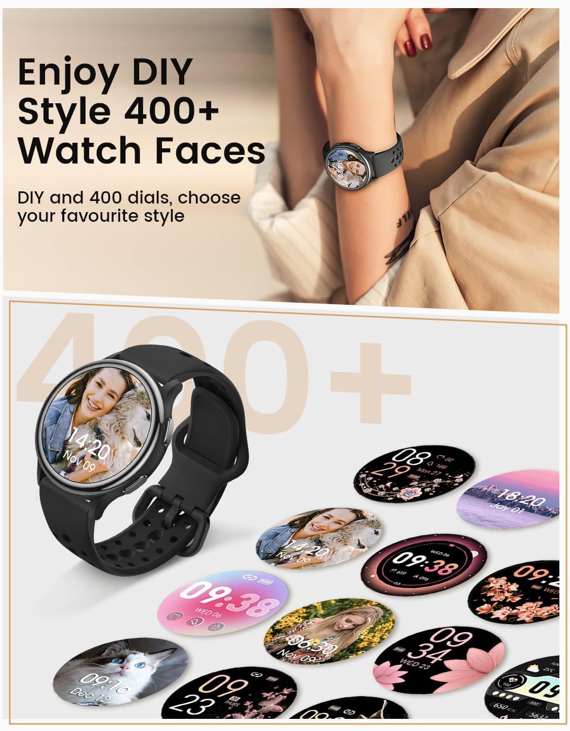 【Chic and Stylish for Every Occasion】: This chic smart watches for women with over 400 stunning watch faces to choose from, and three elegant straps—a woven strap and two soft silicone band—this smart watch is as versatile as your wardrobe. Whether you’re headed to the gym, enjoying a weekend getaway, or out for a night on the town, this watch complements your look effortlessly, making it a stylish extension of who you are.