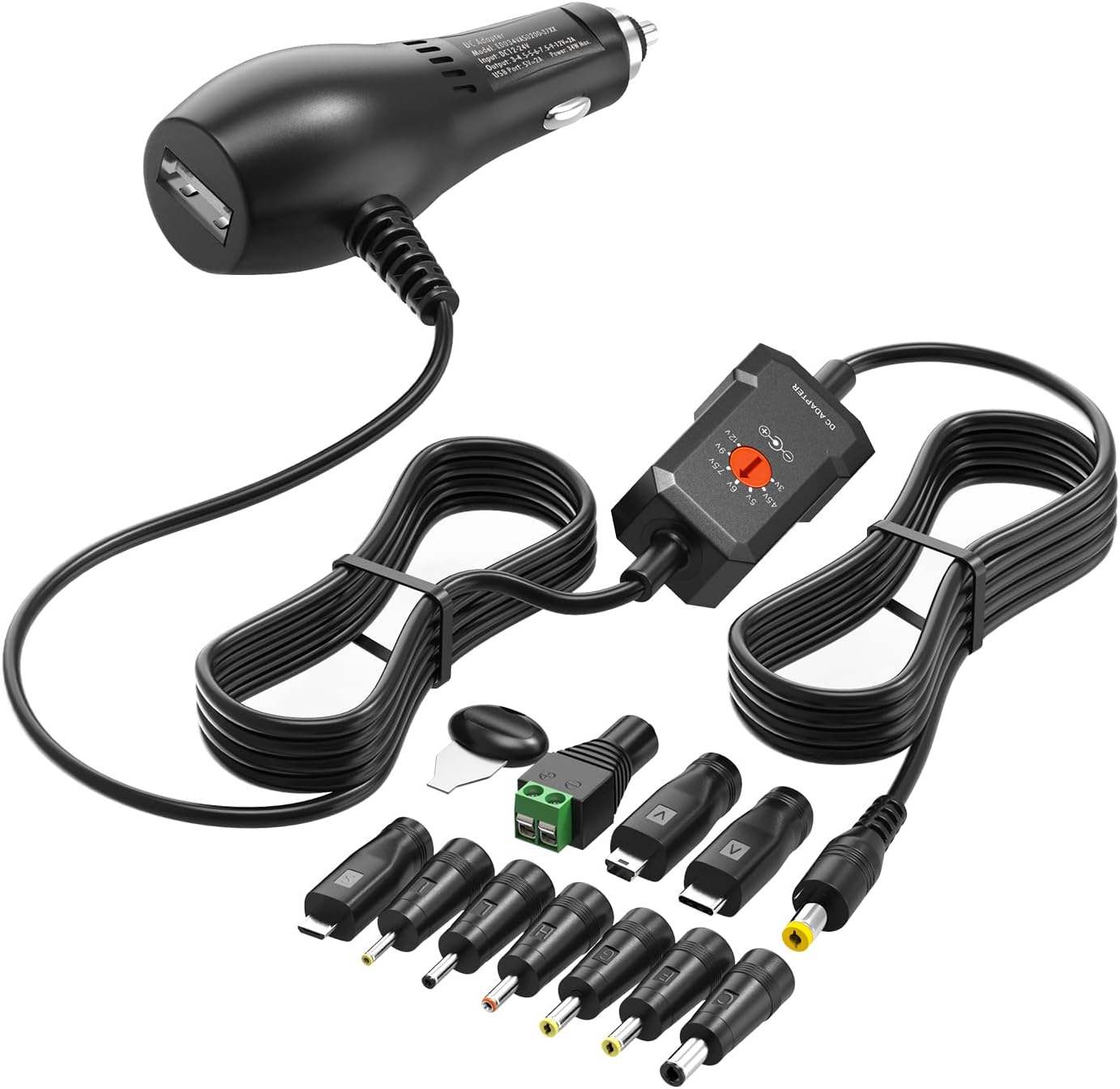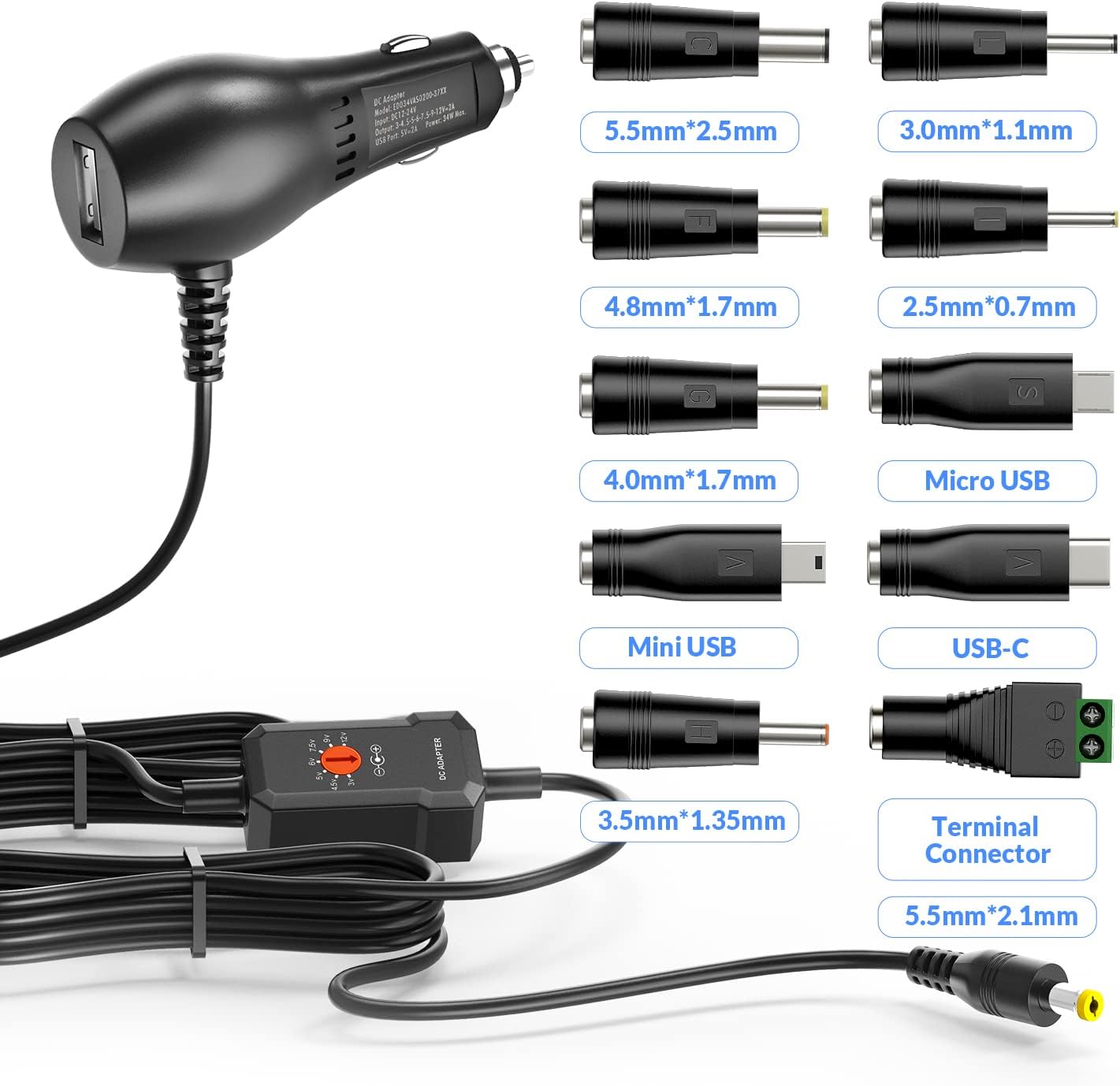 ✔【Multi-Voltage & Multi-Tips】– Adjustable Voltage: 3V, 4.5V, 5V, 6V, 7.5V, 9V, 12V. DC Tips Options: 5.5×2.5mm, 5.5×2.1mm, 4.8×1.7mm, 4.0×1.7mm, 3.5×1.35mm, 3.0×1.1mm, 2.5×0.7mm, Micro USB, LED terminal. The chosen plugs are very popular used in small electronics. With these plugs and different voltage output, widely used in Car, Truck, Bus, Van, Boat, RV, travel triler, etc.