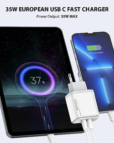 【Universal Compatibility】: This Europe power adapter is 100-240 Volt input ideal for worldwide trips, compatible with iPhone 15/15 Plus/15 Pro/15 Pro Max/14/14 Plus/14 Pro/14 Pro Max/13/13 Pro/13 Pro Max/13 Mini/12/12 Pro/12 Pro Max/11/SE 2020/XR/XS/X/8, for Pad, for earphone, for Samsung S22/S21/S20/S10/S9, Note 20/10, Google, and more.