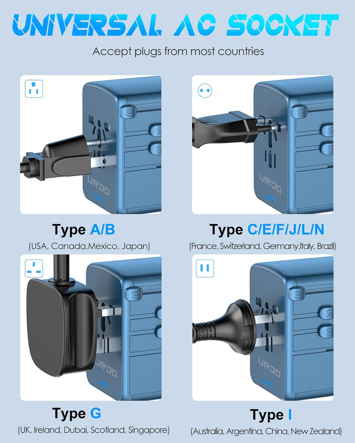 🌐 Incredibly Versatile Universal Travel Adapter✈️ — URJD travel adapter comes with multiple plug configurations, Type A(US), Type I(AU), Type G(UK), and Type C(EU) plugs, directly support outlets in North America, England, Ireland, Europe, Germany, Italy, China, Korea, Australia, Hong Kong, Japan, and Brazil, etc, covers almost every corner of the globe. It does NOT work in India(Type D plug) and South Africa(Type M plug).