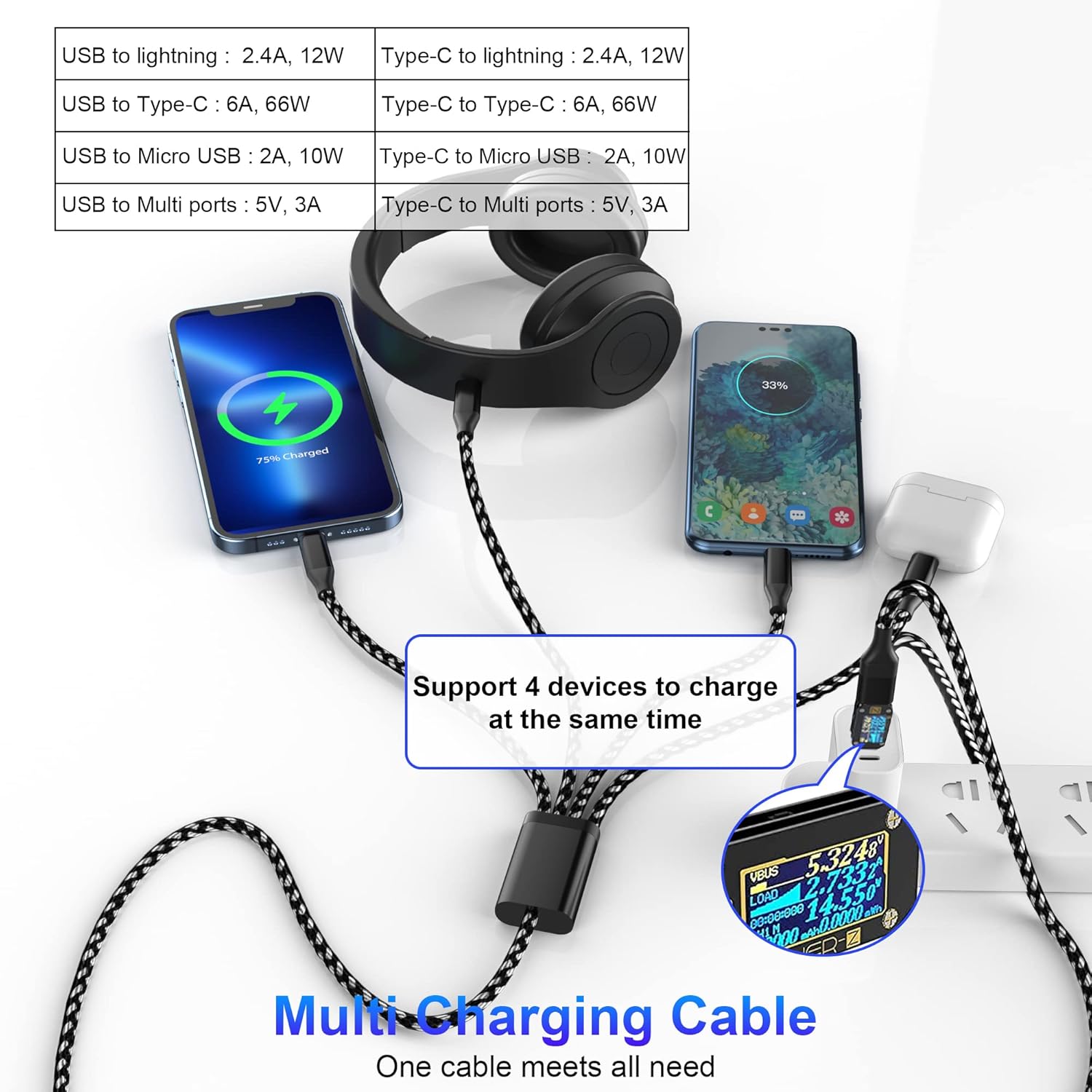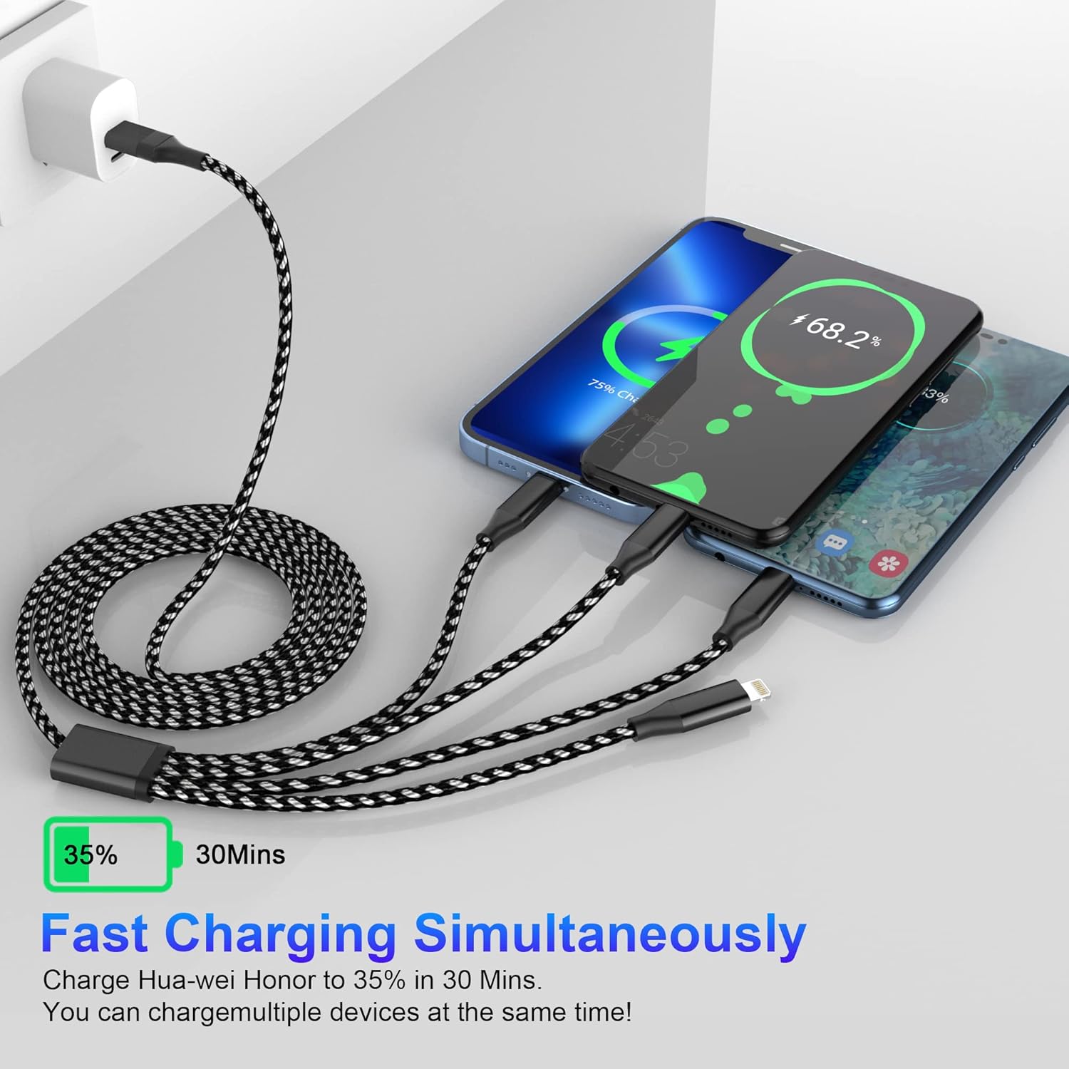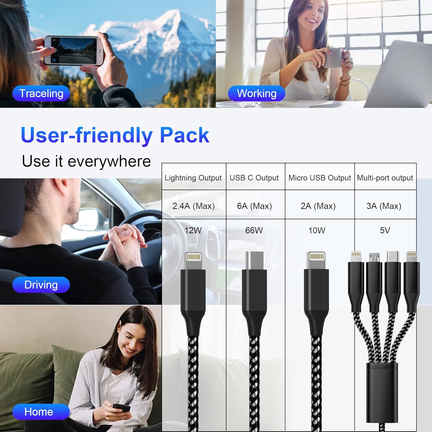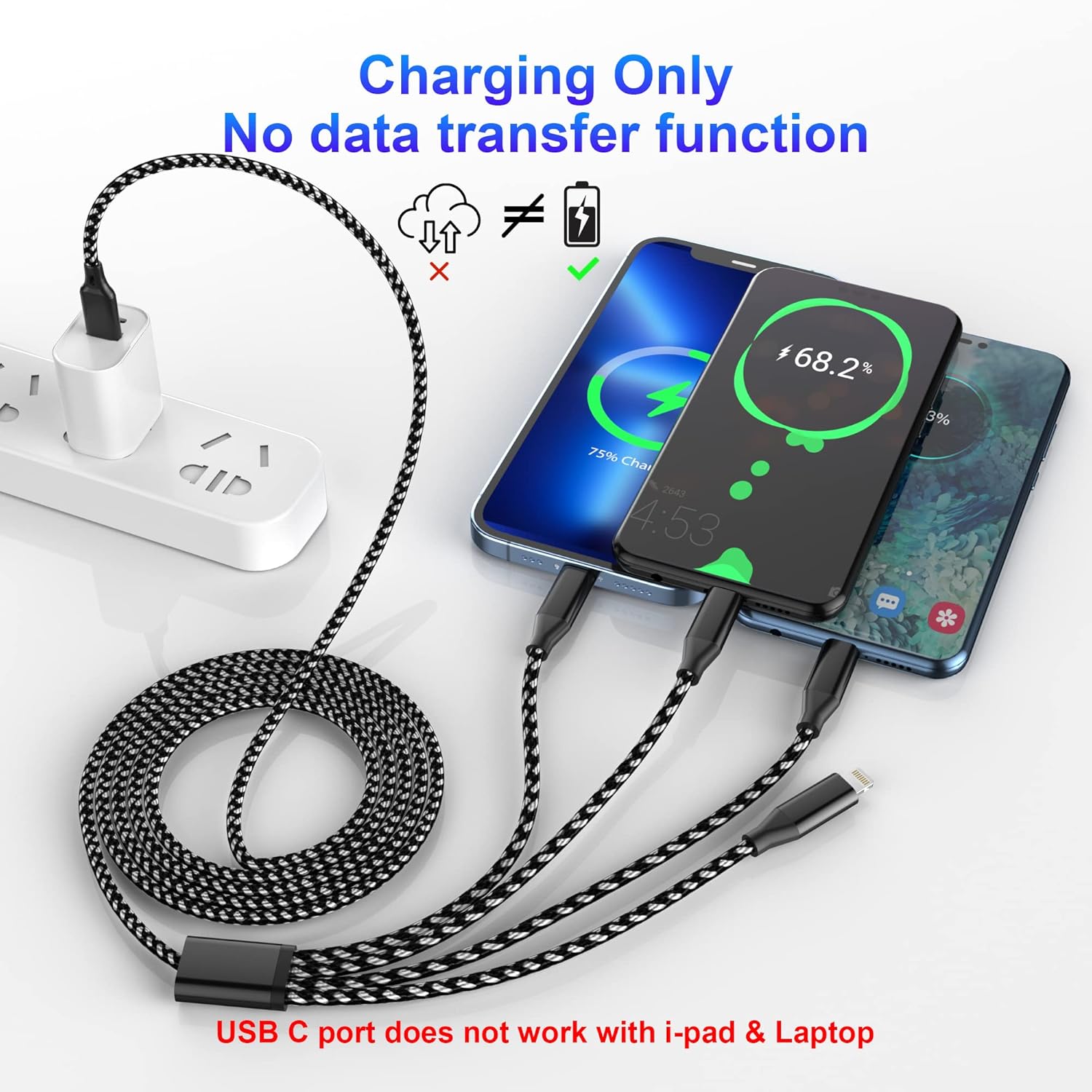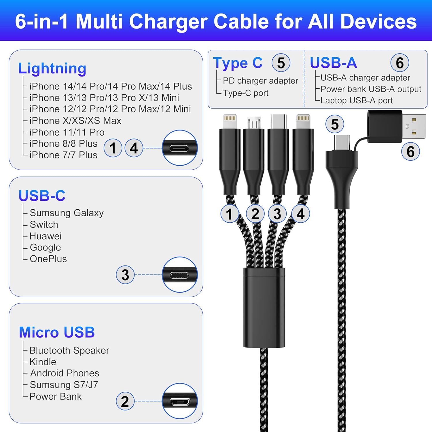🔋【4-in-2 Multi Charging Cable】The USB multi charging cable includes 2-in-1 USB A to USB C port, and 4 charging connecters: Lightning/Lightning/Type C/Micro USB, providing you with 6 different charging needs.1 cable can charge 4 devices at the same time.Charging speed: Lightning:2.4A,Micro USB:2A,Type C:6A. ❤NOTE: Multi USB charging cable is just for charging not for sync data. Type C port does NOT work with i-Pad, tablet, and larger power-requirement devices.