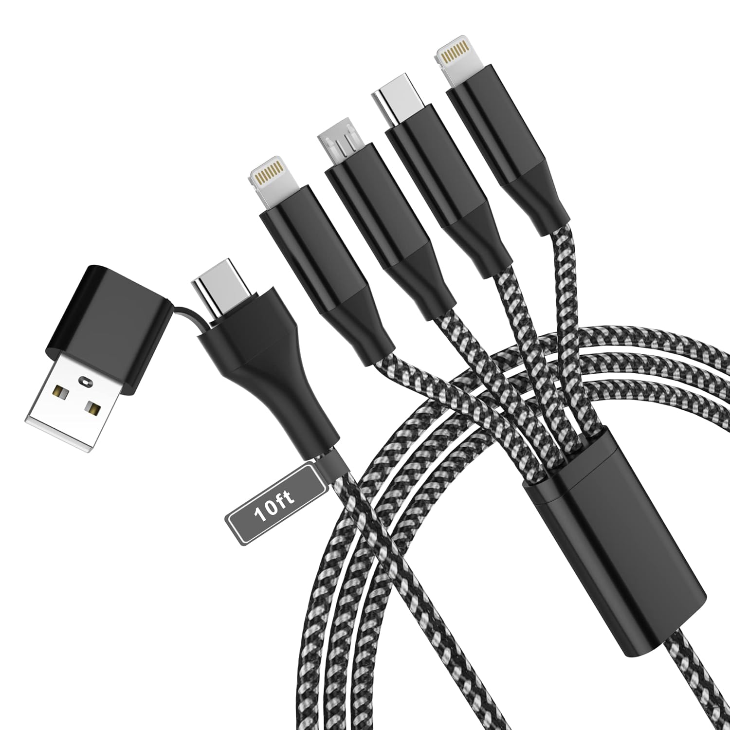 Material: TPE + Aluminum Alloy + Braided CableLength: 10FT/3MInput: USB-A + Type-COutput: Lightning + Lightning + USB C + Micro USBCompatibility: For devices with Lightning/Micro USB/Type-C portsPacking Including: 1* USB A/ USB C to multi charging cable