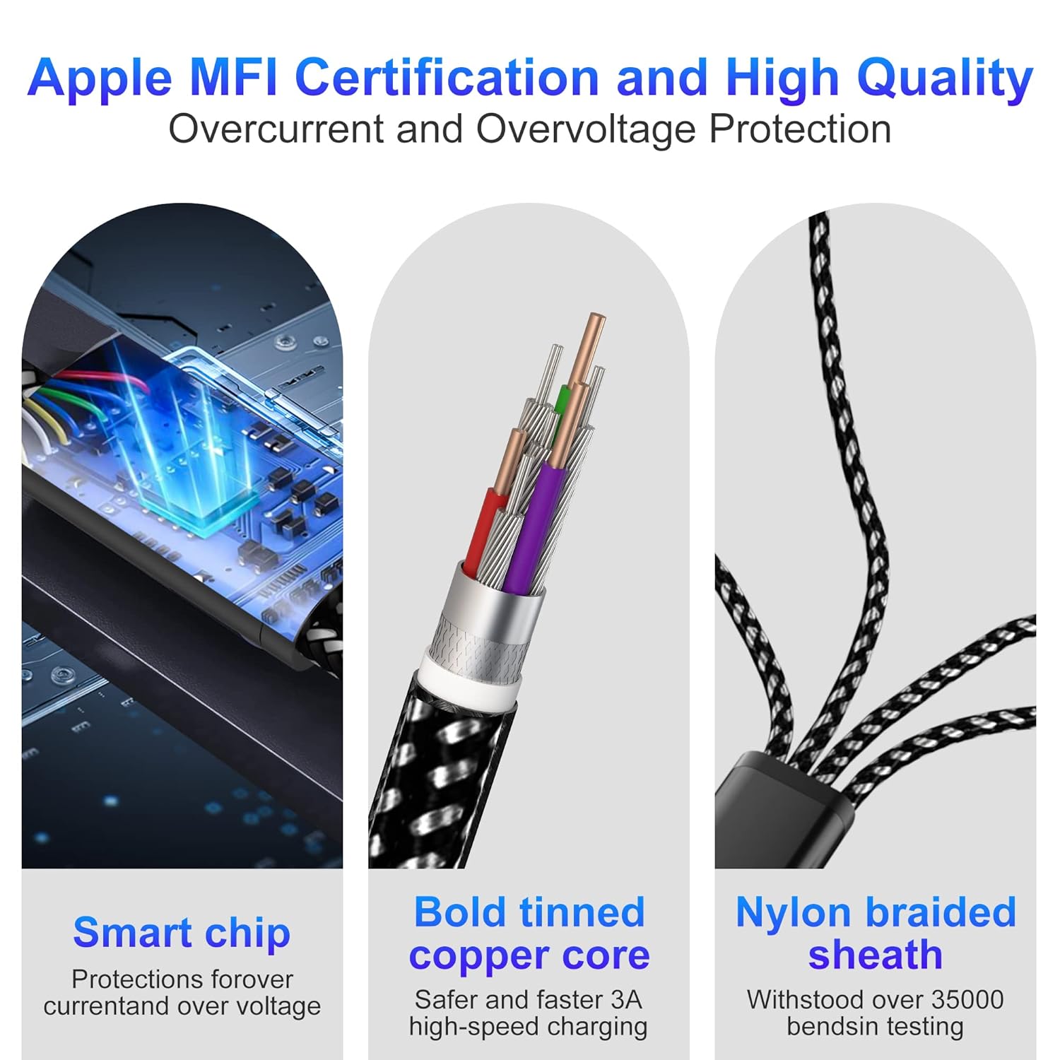 🔋【MFi Certified Multi Charger Cable】Adaptation All USB and Type-C Chargers. Charging multiple devices simultaneously. The 10Ft/3M universal USB A/USB C multi charging cable contains an authorized chip to ensure 100% compatibility with iPhone without error message popping up. High-purity copper wire and thickened copper cores, triple-shielding will keep long-lasting fast charging performance. Connector tested 35000+ times, connection never got worse.