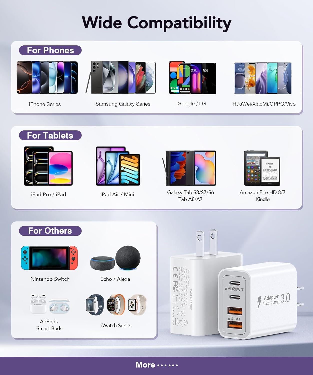 iPhones iPhone 16/16 Pro/16 Pro Max/16 Plus/15/15 Pro/ 15 Pro Max/15 Plus, iPhone 14/14 Plus/14 Pro/14 Pro Max, iPhone 13/13 Mini/13 Pro/13 Pro Max, iPhone12/12 Mini/12 Pro/12 Pro Max, iPhone 11/11 Pro/11 Pro Max, iPhone SE 1/2, iPhone X/XR/XS/XS Max, iPhone 8/8 Plus, iPhone 7/7 Plus, iPhone 6/6S/6S Plus Apple Accessories AirPods 1/2/3/4/Pro/Max, MagSafe Charger, Apple Watch Series Ultra/SE2/SE/10/9/8/7/6/5/4/3/2/1/iPod touch 5/6/7, iPod nano 7 iPads iPad Pro 12.9″ 1/2/3/4/5/6, iPad Pro 11″ 1/2/3/4, iPad Pro 10.5″/9.7″, iPad Air 1/2/3/4/5, iPad Mini 1/2/3/4/5/6, iPad 4/5/6/7/8/9/10 Samsungs Samsung Galaxy S24/S24+/S24 Ultra/S23/S23+/S23 Ultra/S22 Ultra/S22+/S22/S21 FE/S21 Ultra/S21+/S21/S20 Ultra/S20+/S20 FE/S20 Lite/S20/Note 20/Note 20 Ultra/Note10+/S10/S10e/S10+/S9/S9+/S8/S8+/Note 9/Note 8/A73/A72/A53/A52/A33/A32/A03 and more Series Android Phones Moto G82, Moto E32, Moto G Stylus(2022), Moto Tab G70, Moto G71 5G, G41, G40 Fusion G31, G Power(2022), G51, G51 5G, G50 5G, G60s, G20, G100, E30, E40, E20, E7i Power, E7 PowerEdge S30, X30, G200 5G, Edge (2021), 20 Fusion, 20 Pro, 20, 20 Lite, Google Pixel 5/4XL/4/3XL/3/2XL/2/XL, Nexus 5X/ 6P, Sony XZ2 Premium/Sony XZ3/Moto edge S30/X30/S Series/HUAWEI Mate/P/Nova Seriesand more Other Accessories Wireless Chargers, Wireless Earbuds, Smartwatch, Switch and more USB C devices. Tablets Samsung Tab A8/A7/S8+/S8/S7+/S7/S7 FE/S6/S5/S5e/S4/S3; Lenovo Tab M10 / P10 / M8 / V7 / E10 / E7, Google Pixel Slate 12.3”, Fire HD 10/ Fire HD 8/ Fire, Kindle etc.Samsung Tab A / 4 / S6 / S5 / S5e / S4 / S3; Lenovo Tab M10 / P10 / M8 / V7 / E10 / E7, Google Pixel Slate 12.3”, Fire HD 10/ Fire HD 8/ Fire, Kindle etc. Specification Input: 100-240V, 50-60Hz 0.6A Output:20W 5V/3A, 9V/2.22A, 12V/1.66A Total 40W Max