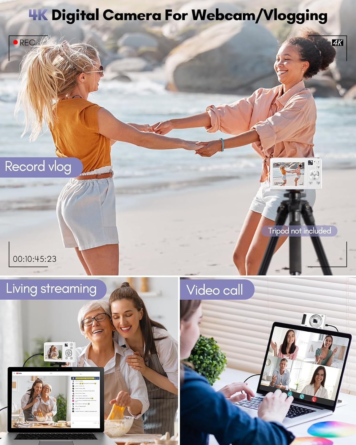 【4K Video Blog Camera with Pause Function】This video blog camera supports 4K video mode, and the dual cameras can switch the content and composition perspective as you wish. Press the “OK” button to pause while recording or playing back video, making use of the pause function. The camera also supports mounting on a tripod for use as a webcam. Equipped with two rechargeable batteries and the ability to record while charging, you never have to worry about running out of power during shooting.