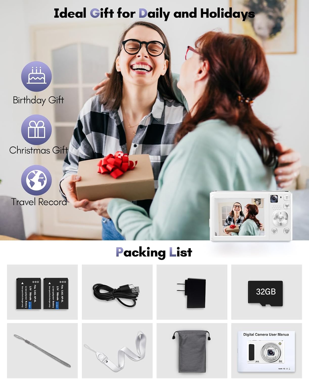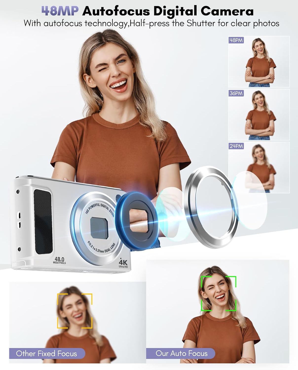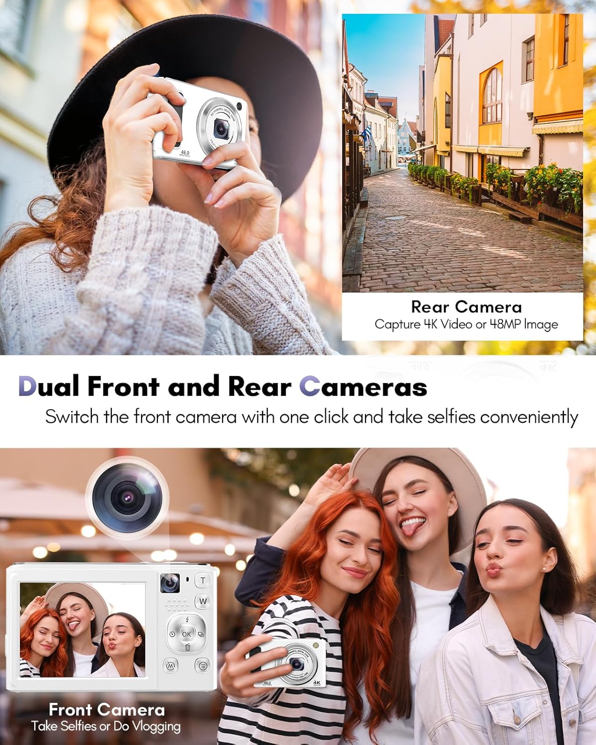 【48MP Dual-Lens Digital Camera, Easily Record Your Travels!】This digital camera uses the latest CMOS image sensor system, allowing you to easily capture stunning 48MP HD images. Equipped with dual lenses, it enables one-touch switching between selfies and landscape photos without the need for assistance. Even beginners can take amazing photos of people, scenery, selfies, and more during their travels!