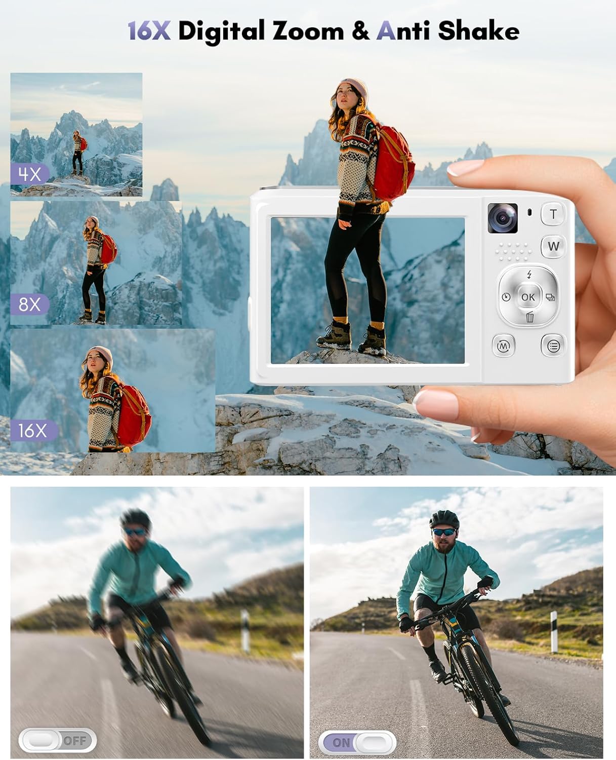 【Autofocus 4K Digital Camera for Photography】This compact digital camera features an innovative autofocus system. In photo mode, lightly tap the capture button to keep the camera steady to activate autofocus. When you see the focus frame on the screen change from yellow to green, the focus is complete. Fully press the capture button to take the clearest and most vivid photos. The W/T button allows you to adjust the 16x digital zoom, making it easy to capture distant scenery.