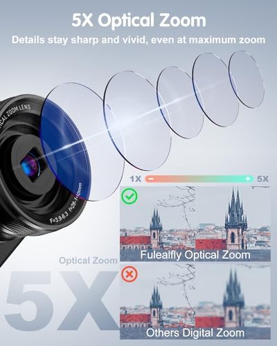 【5X Optical Zoom Lens & Six-Axis Anti-Shake】Picture this -zooming in on distant scenery while maintaining clarity. The Fulealfly 5X optical zoom provides the same magnification as a 16X digital zoom, but unlike digital zoom, our optical zoom lens retains sharpness even at maximum magnification. Now, let’s talk stability. Whether capturing vibrant city scenes or fleeting moments of spontaneity, our professional camera 6-Axis Anti-Shake ensures your photos and videos remain steady.