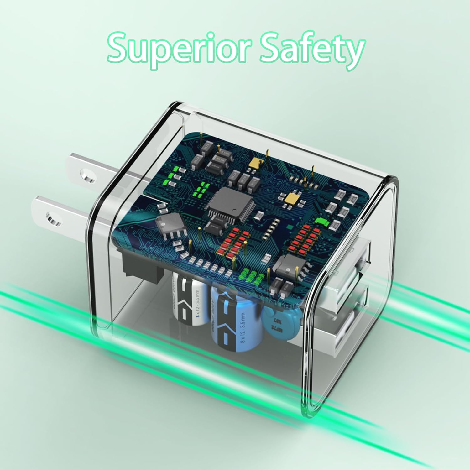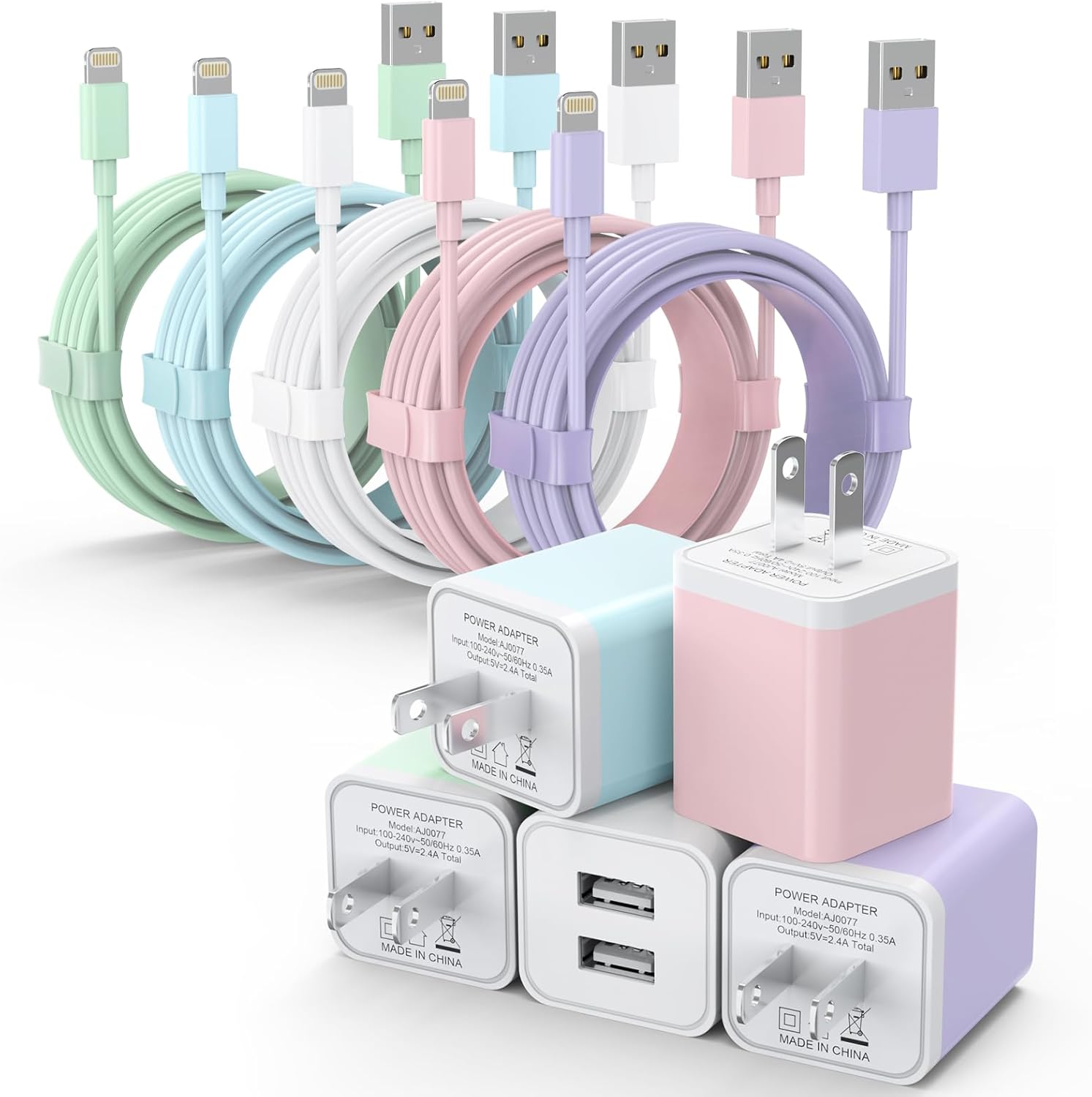♦Specifically Designed: Choose color between White, Blue, Green, Purple and Pink to find the look that suits you. 5 Pack Dual USB ports USB charger with cable allow you charge with two devices, when you need to charge more device at home, house, office, it is convenient and save the space.