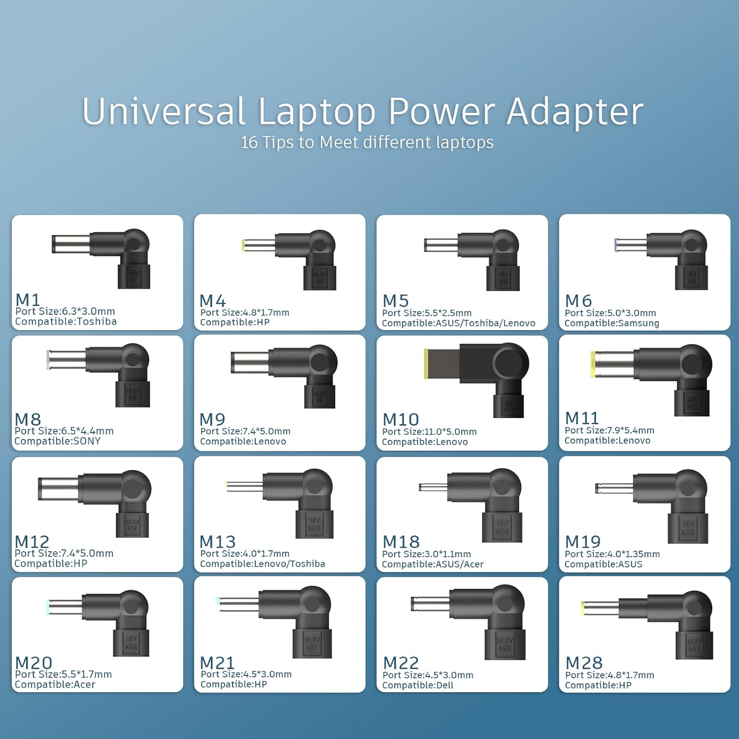 90W Universal Laptop Charger 15-20V Connectors’ Specification & Partial Applicable Models: