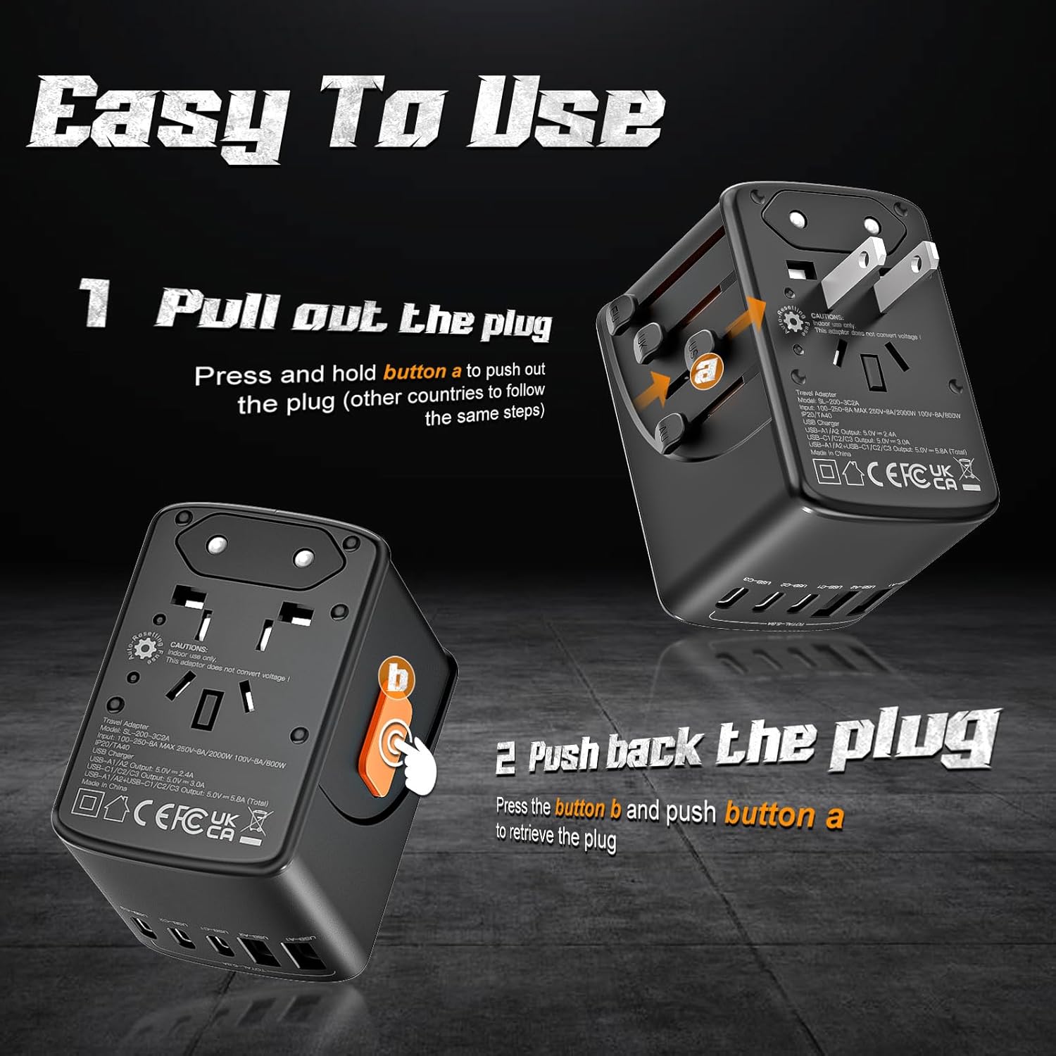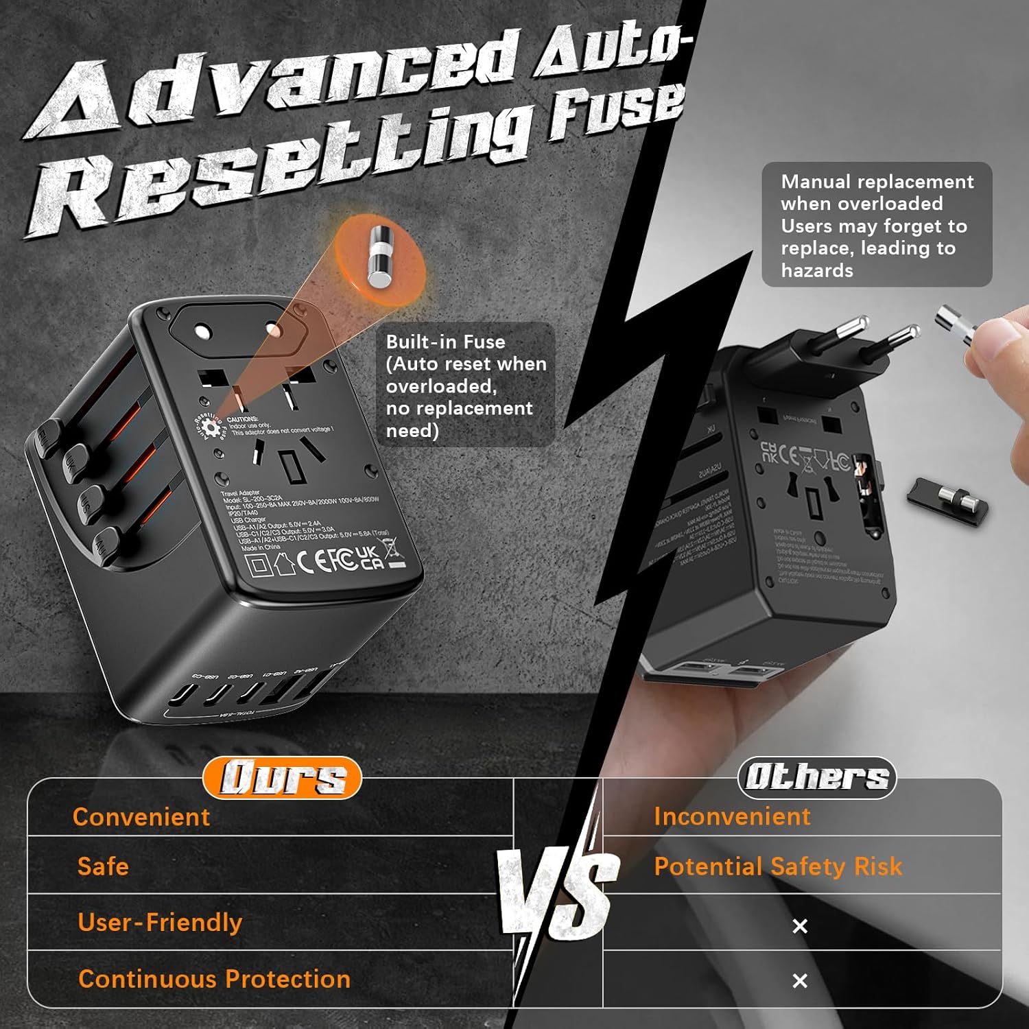 Advanced Automatic Fuse for Superior Protection: Unlike traditional fuses that blow out and require replacement, our travel adapter features an advanced automatic 8A fuse that instantly resets after an electrical overload is resolved. This innovative design ensures continuous safety and convenience, allowing you to travel worry-free without the need to carry spare fuses.
