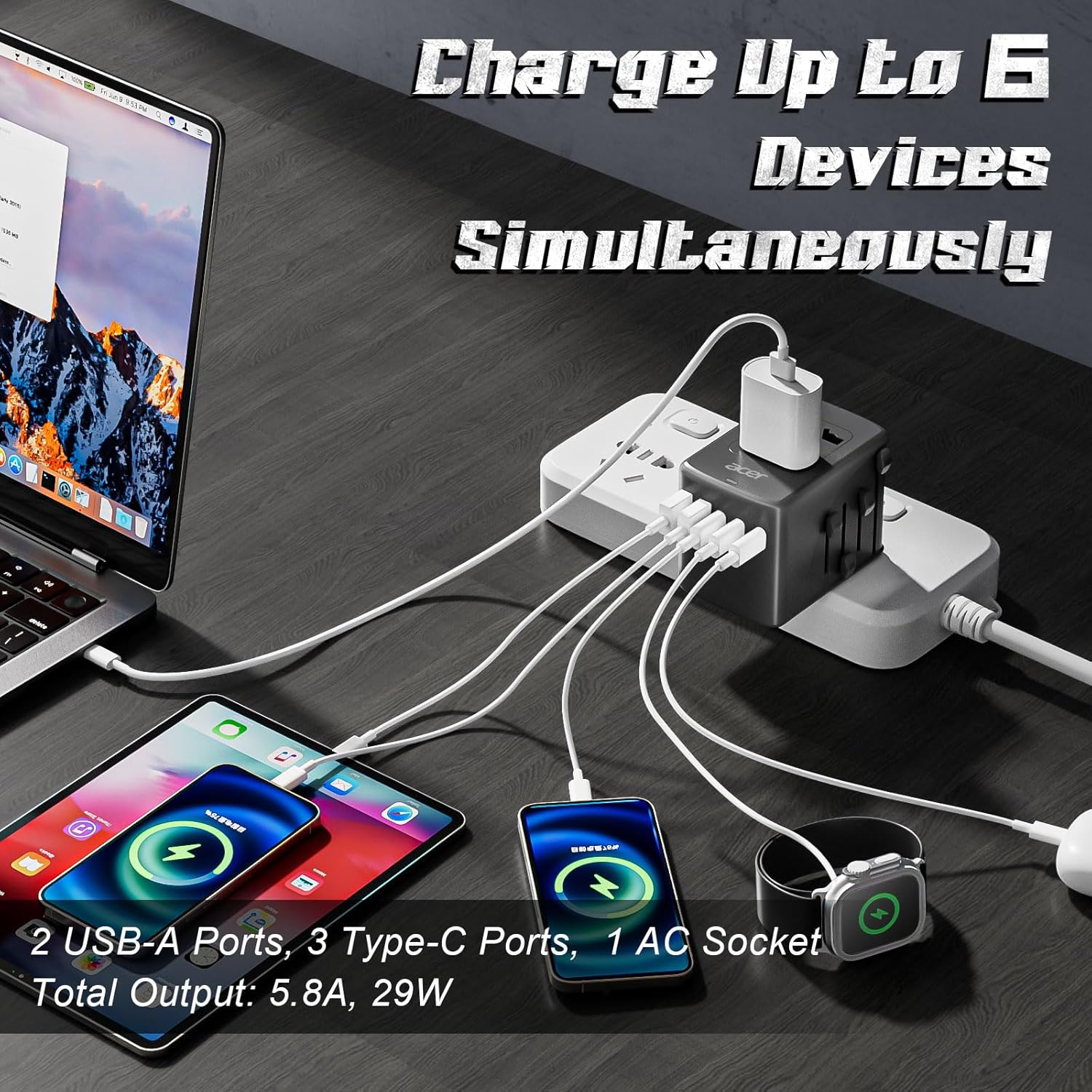 Multi-Device Charging :Equipped with 3 USB-C ports (up to 3.0A/15W each) and 2 USB-A ports (up to 2.4A/12W each), this adapter is perfect for charging multiple devices simultaneously. Total USB output: 5.6A/29W max—ideal for laptops, smartphones, tablets, cameras, and more.