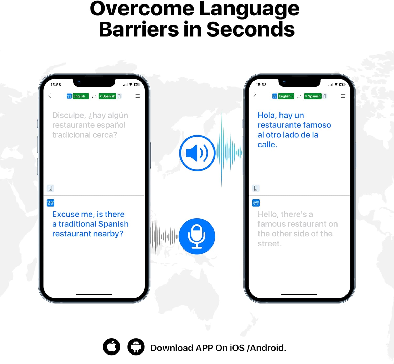 Multi-language translation: High-precision 144-language translator earbuds, real-time two-way translation and certain off-line package requires in-app purchase including Chinese, English, Japanese, Korean, Russian, German, French and Spanish