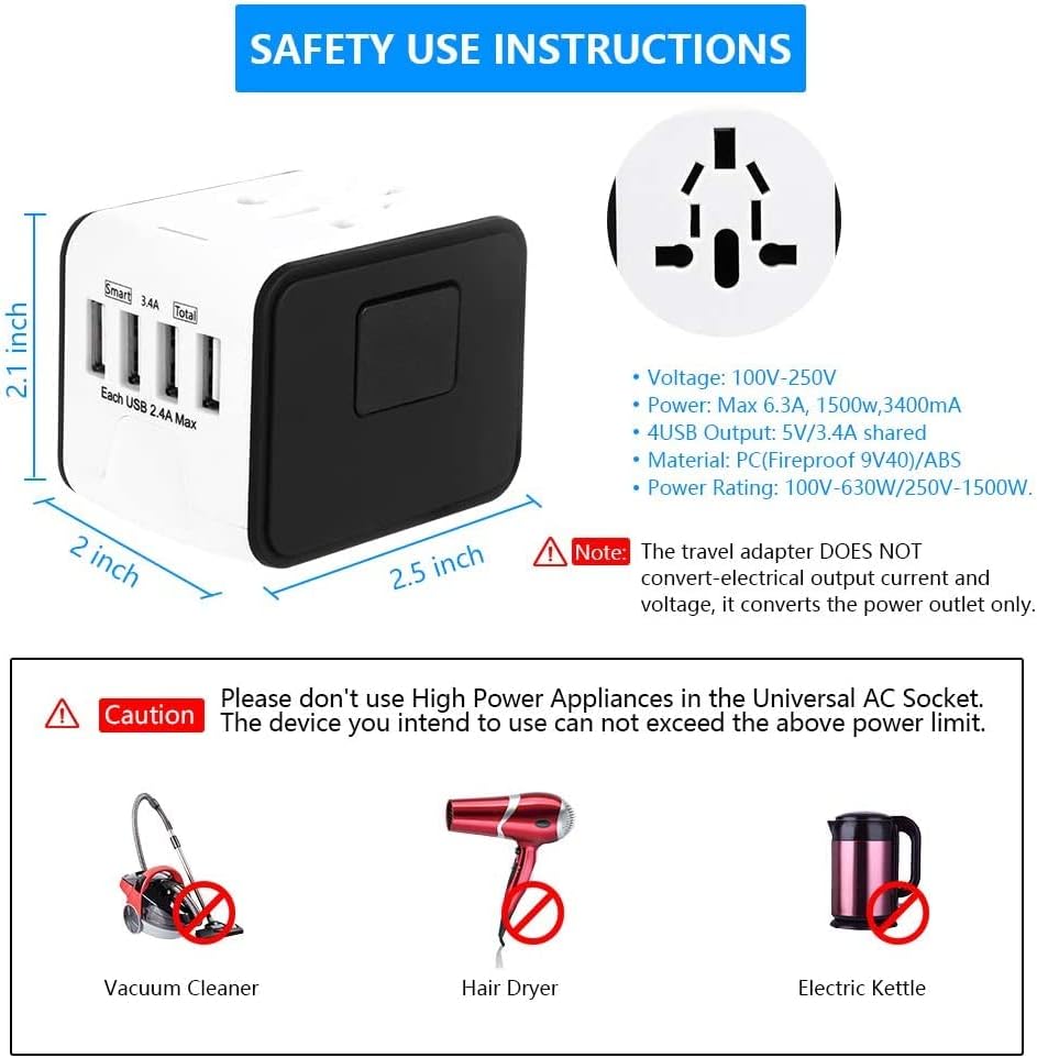 ★POWER RANGE – AC 100V-250V, MAX 6.3A output. 2400mA 5V 3.4A 4 usb worldwide travel charger. 4 AC power plug sockets – Output: 630W at 100v, 1500W at 240v. High power universal travel adapter all in one offer you a safer and efficient charging for your devices