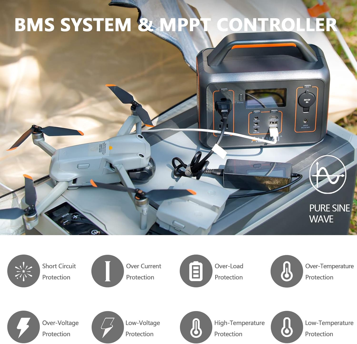 【BMS System】The generator adopt premium lithium ion batteries to ensure you and your devices safety while use. Support 1500 life cycle. The BMS and MPPT Controller is built in multiple protections via LCD screen icon flash.