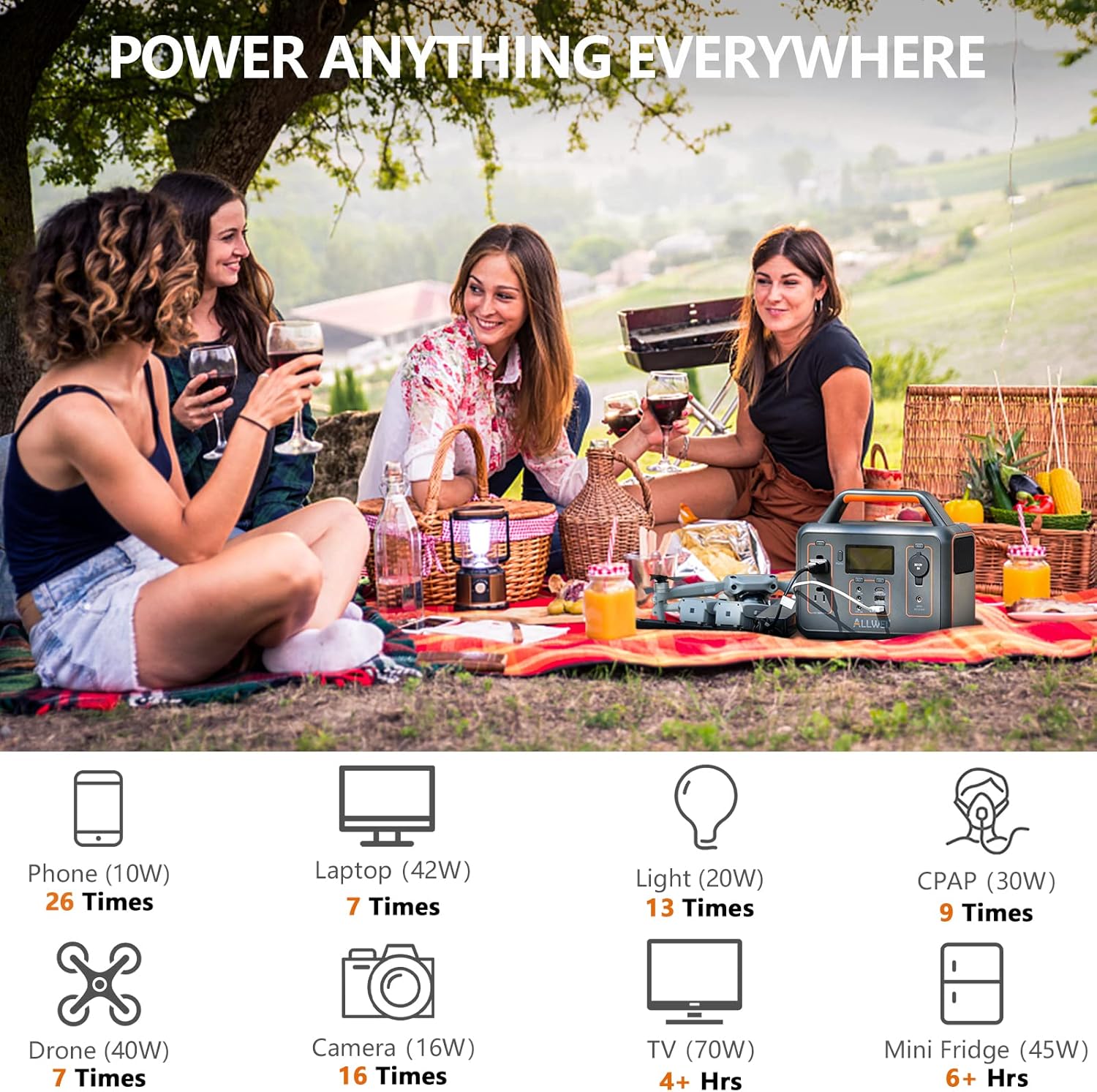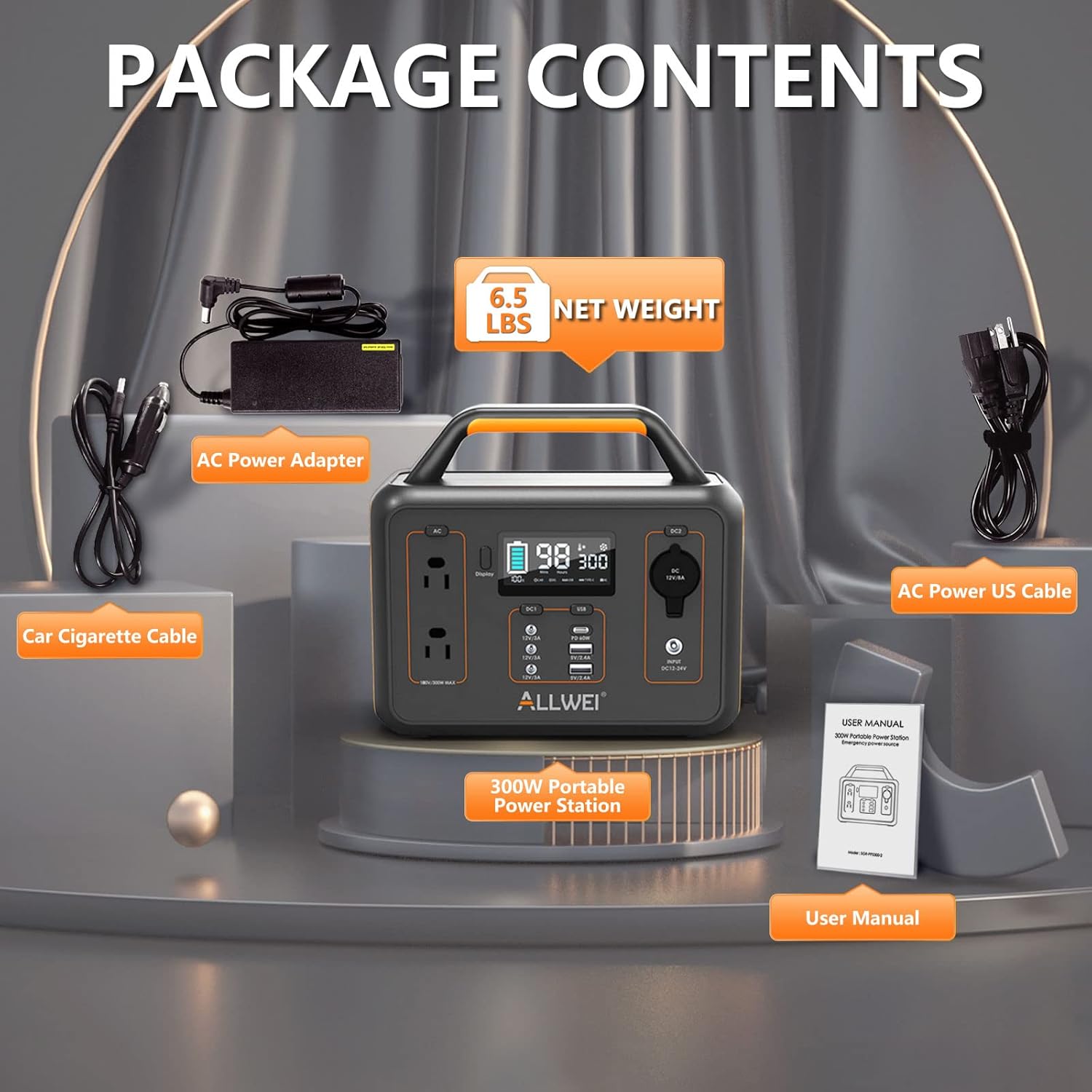【Package Contents】1x ALLWEI 300W Portable Power Station(280Wh Small Generator), 1x AC Power Adapter, 1x AC Cable, 1x DC Car Cable, 1x User Manual (ALLWEI Solar Panel sold separately).