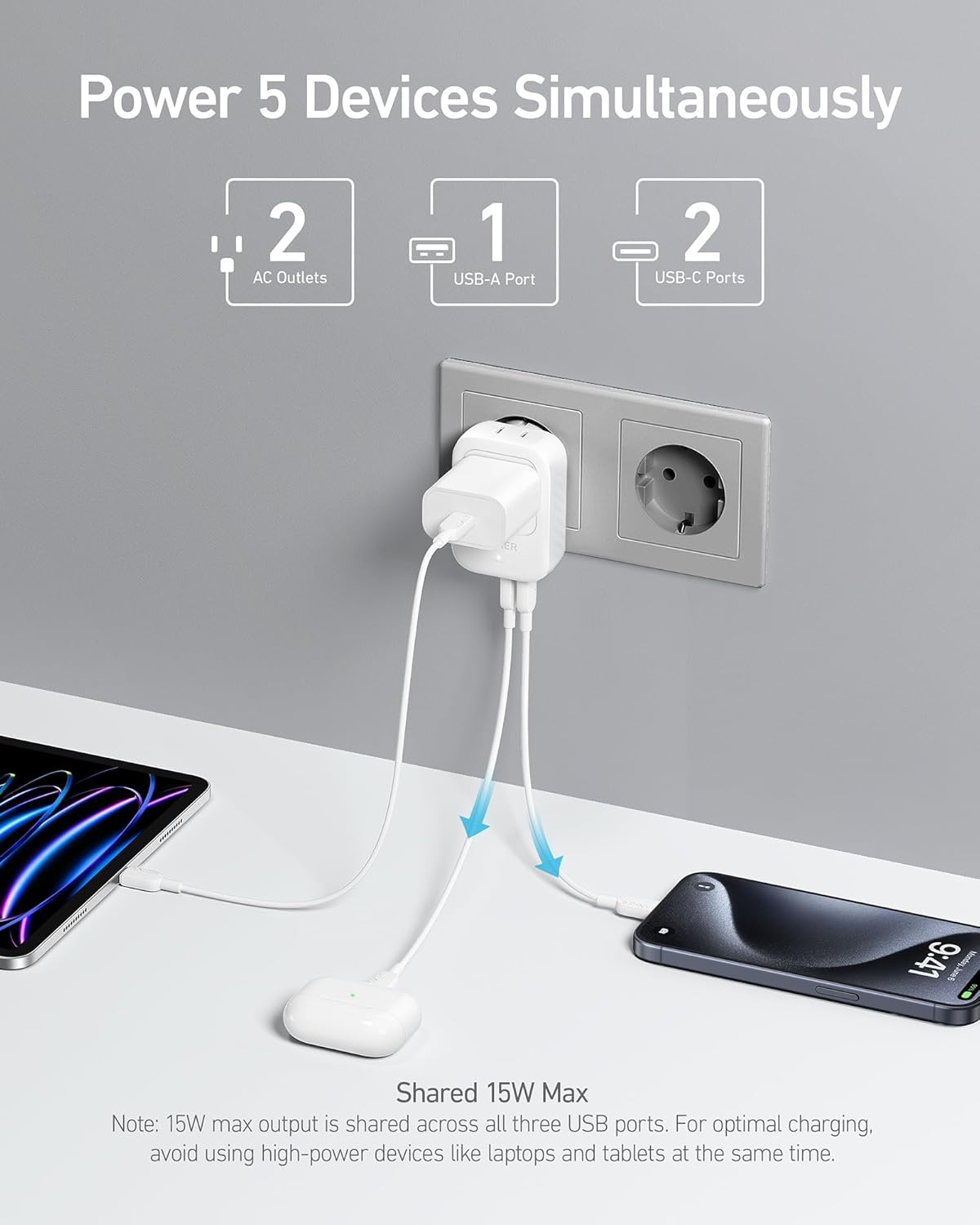 5-in-1 Versatile Adapter: Maximize your charging capabilities with 2 AC outlets, 2 USB-C, and 1 USB-A port. The high-speed USB-C port can charge an iPhone 15 up to 50% in just 47 minutes.