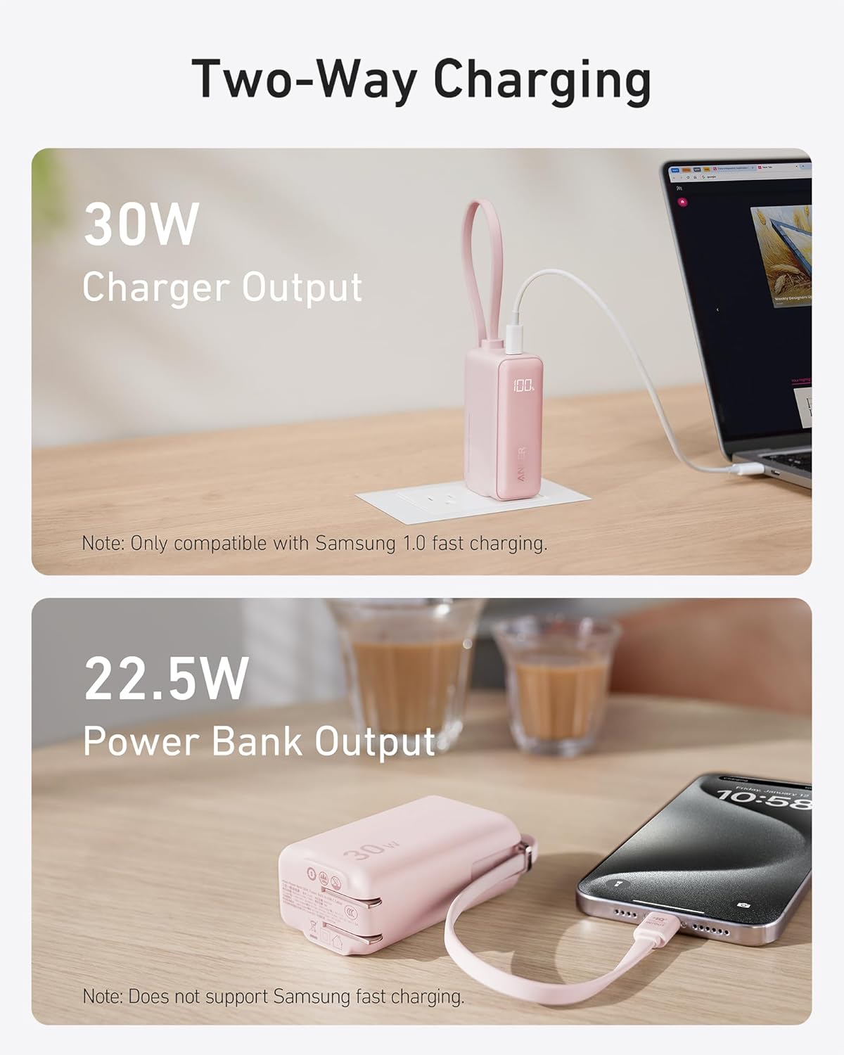 Two-Way Fast Charging: Plug in for a 30W charge to power your devices quickly, or switch to battery mode for a consistent 22.5W charge, keeping your gadgets energized during your travels.