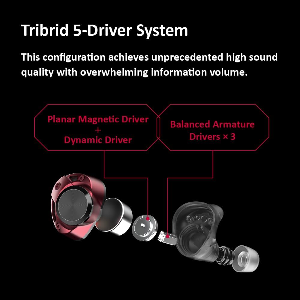 Revolutionary Tribrid Technology: Experience superior sound with our world-first 5-driver system including dynamic, planar magnetic, and balanced armature drivers for rich lows, smooth mids, and crisp highs.