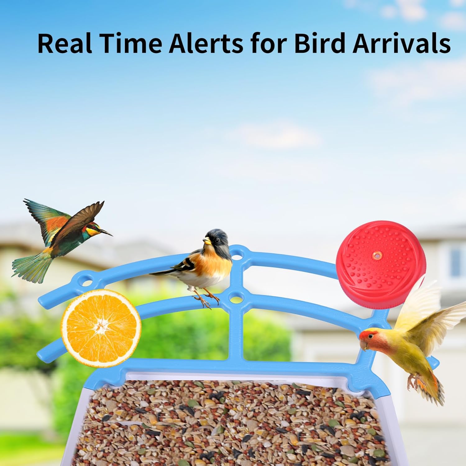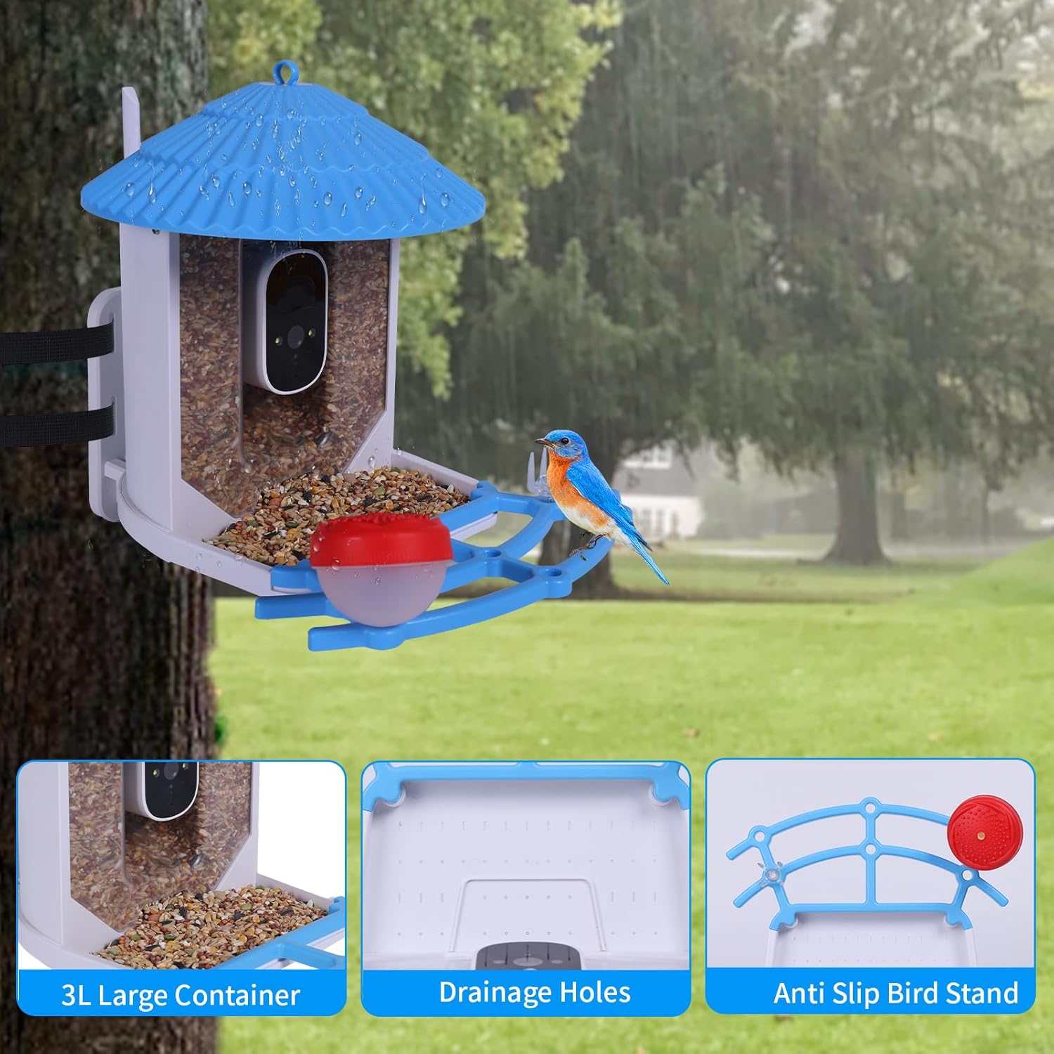 【US-Patented Smart Bird Feeder Design】IP66 waterproof, separate dry/wet compartments, anti-slip perches for birds, multiple drainage outlets preventing food spoilage, and a 3.0L capacity for less refill frequency. Includes fruit forks and hummingbird feeder, attracting various wild birds. Squirrel-proof bird camera feeder design.