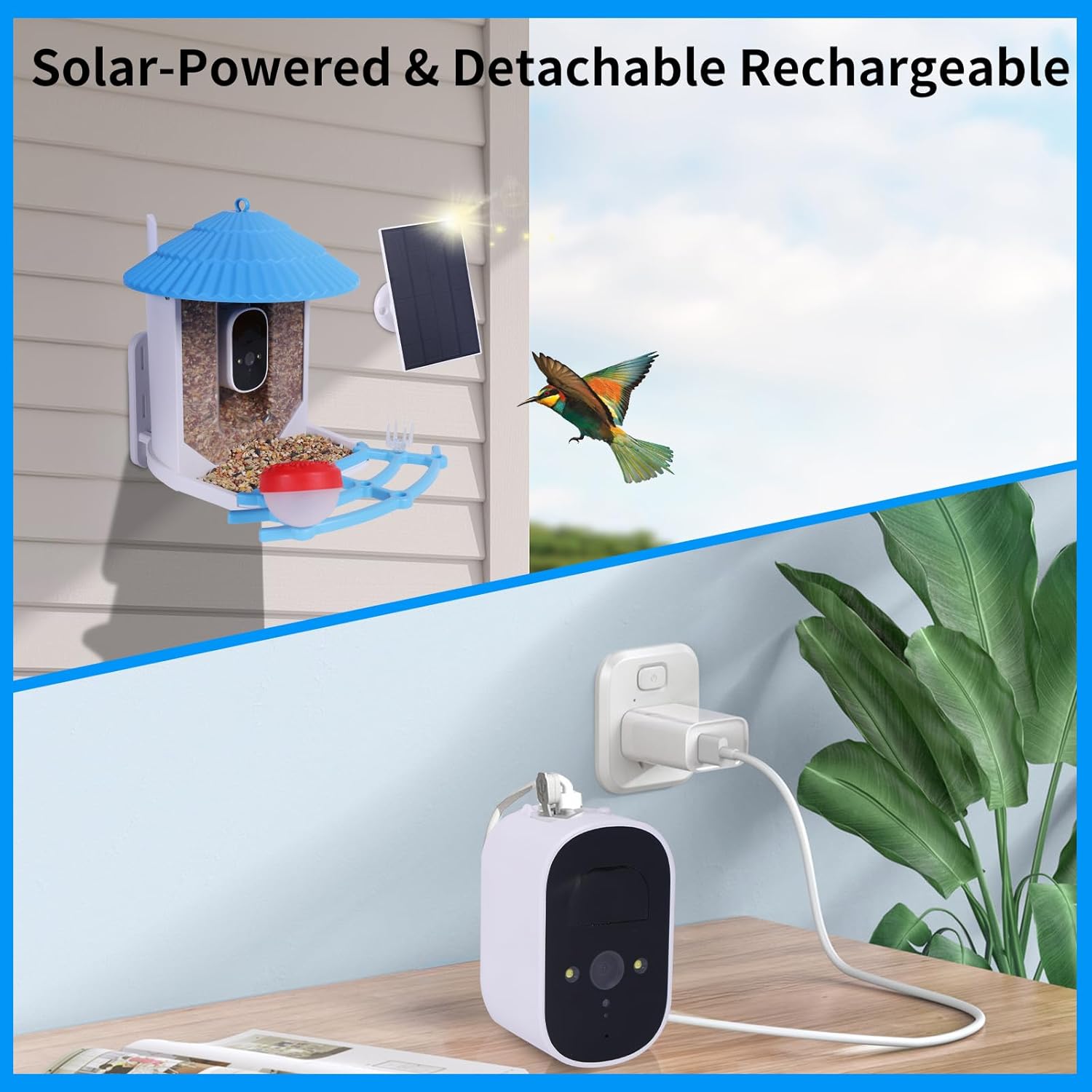 【Dual Power Supply Options】Enhance your birdwatching experience with our smart bird feeder with camera solar powered: Utilize a rotatable 7W solar panel for continuous day and night charging. Enjoy vibrant color images and videos in 1080P resolution round the clock. Rechargeable battery with Type-C charging ensures 4-6 months of usage. Detachable birdhouse camera for convenience.