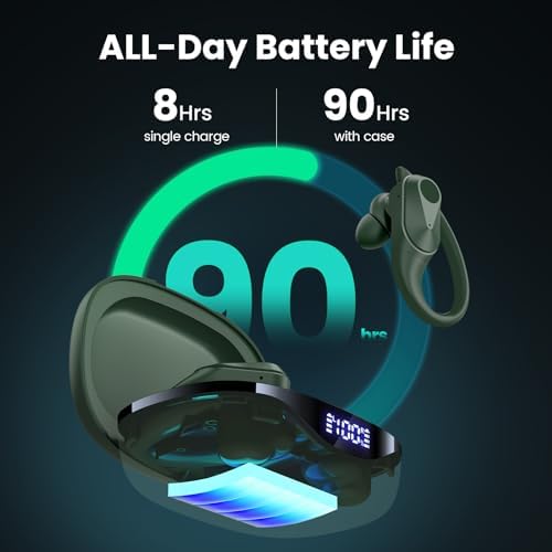 Extended 90 Hours Playback Ear Buds: Our C17 wireless earbuds boast a 70mAh battery, allowing up to 8 hours for continuous use (at 50%-60% volume) on a single charge. With the 600mAh large-capacity charging case, you can enjoy a total playtime of approximately 90 hours and keep grooving to your favorite tunes all day long. With an external digital LED display on the charging station, you will easily keep track of the battery level without opening the case and plan your charging accordingly.