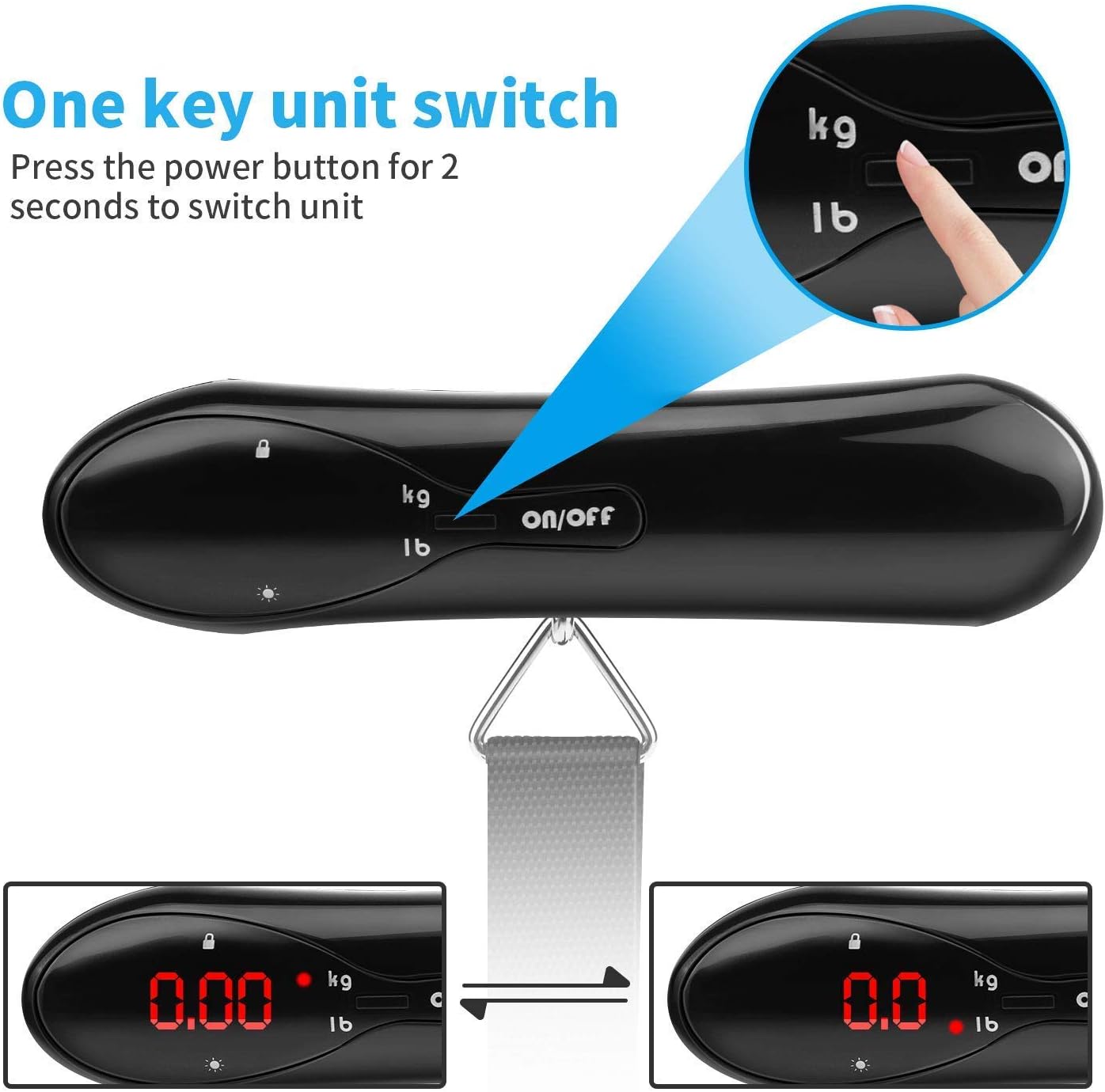★Keep the hook/strap upright in natural state when you switch on the scale;