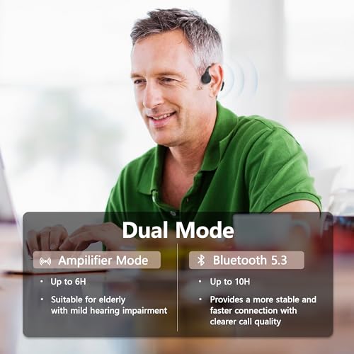 【Amplifier Mode & Bluetooth Mode】Amplified Mode is designed for middle-aged people with mild hearing impairments, with up to 6 hours of use time and clear audio for better communication and the volume can be adjusted by buttons; Bluetooth V5.3 provides a more stable and faster connection for up to 10 hours of daily calls and music enjoyment.