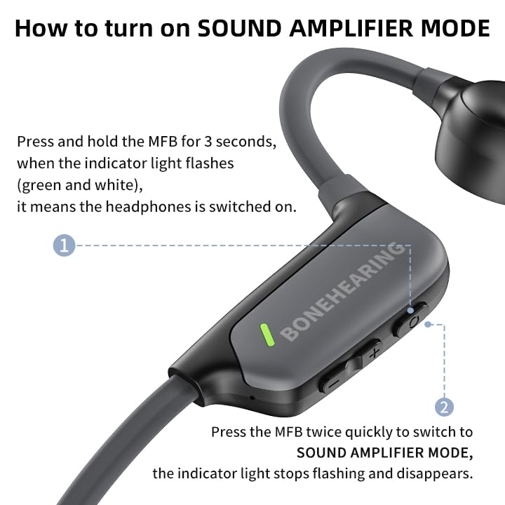 【How to turn on SOUND AMPLIFIER MODE】 1.Press & hold the Multi-Function Button for 3 second, it is power on when the indicator light flashes (green and white). 2. Press the Multi-Function Button twice quickly, it switches to the SOUND AMPLIFIER MODE and the light stop flashing and disappear.