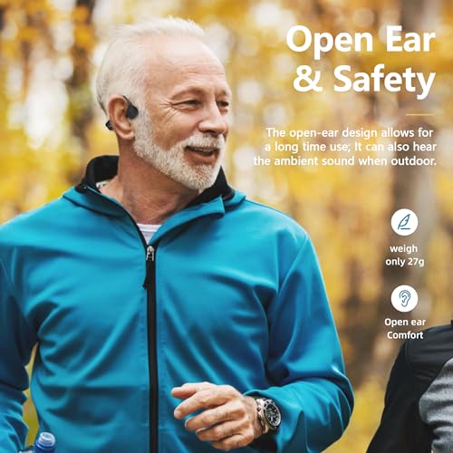 【Open Ear Design & Ultra-Light Weight】The open ear design uses ergonomic ear hooks so that the headphones can be enjoyed for a long time without having to go into the ear, effectively reducing damage to the eardrum, while still being able to hear the ambient sound and improve safety outdoors; the headphones are covered in silicone for a comfortable feel, weigh only 27g, and the headband can be bent 360° for a lighter wear.