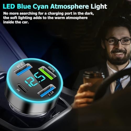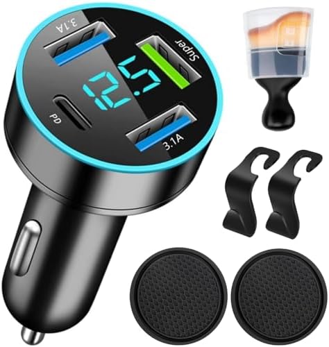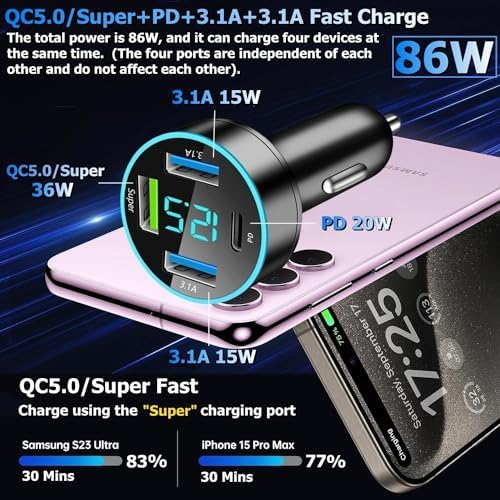 ⚡【4-port fast car charger】:Equipped with four charging ports, QC5.0/Super+PD+3.1A+3.1A, providing a total power output of up to 86W, it can charge 4 devices at the same time. The four ports are independent of each other and do not affect each other. Charging at the same time will not reduce the charging power of one or more ports. When charging with the “super” charging port, you will enjoy super fast charging speeds, charging most mobile phones to about 80% in just 30 minutes. (Please note: the mobile phone and charging cable must support the fast charging protocol at the same time, otherwise the “super” charging port will charge at standard speed).