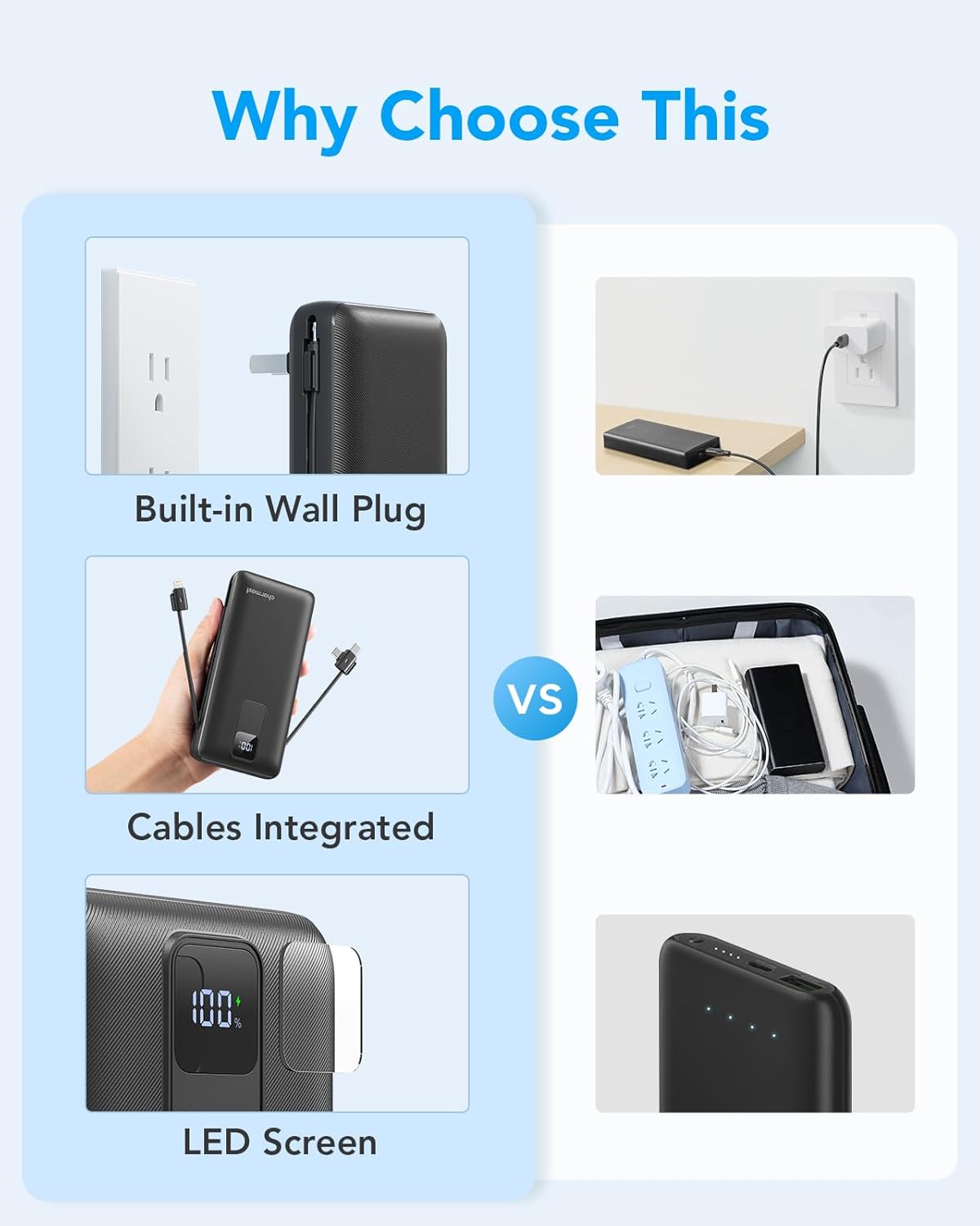 Portable Charger with Built-in Cables and Wall Plug: Two cords and wall plugs integrated allows the Charmast power bank to be compatible with all cellphones, so you don’t need to bring extra chargers or get frustrated with a tangled mess of wires.