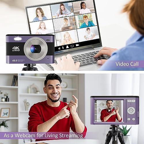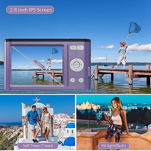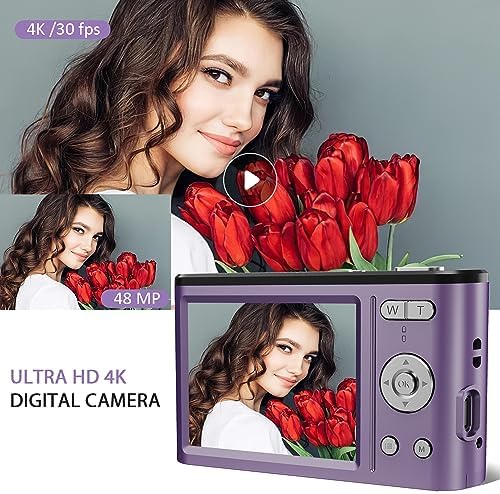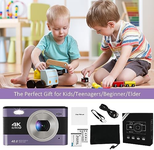 Digital Camera 4K 48MP Kids Camera with 2.8 inch IPS Screen, Portable Compact Point and Shoot Camera for Kids Beginners,Students,Teens with 32GB Card and 2 Batteries (Purple)