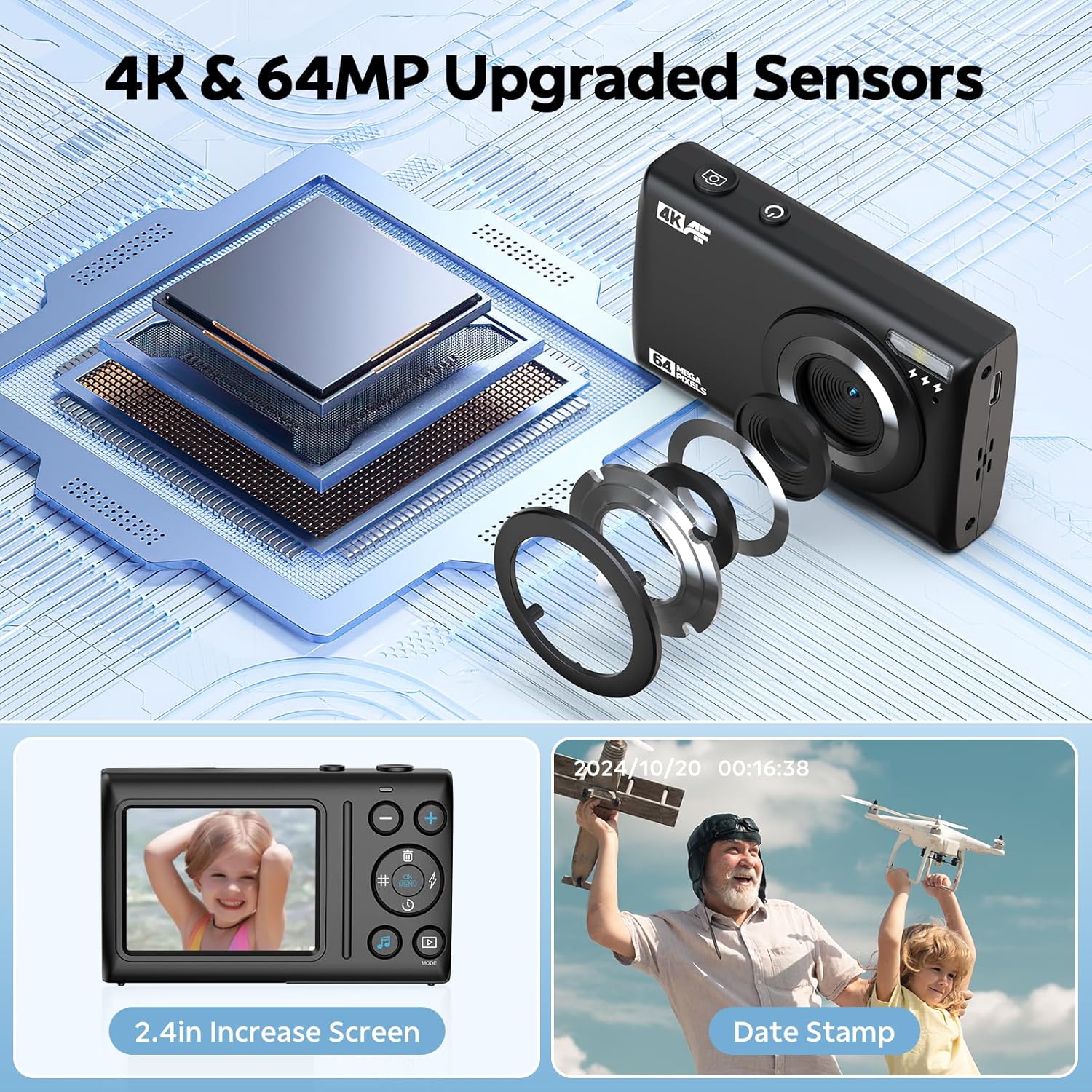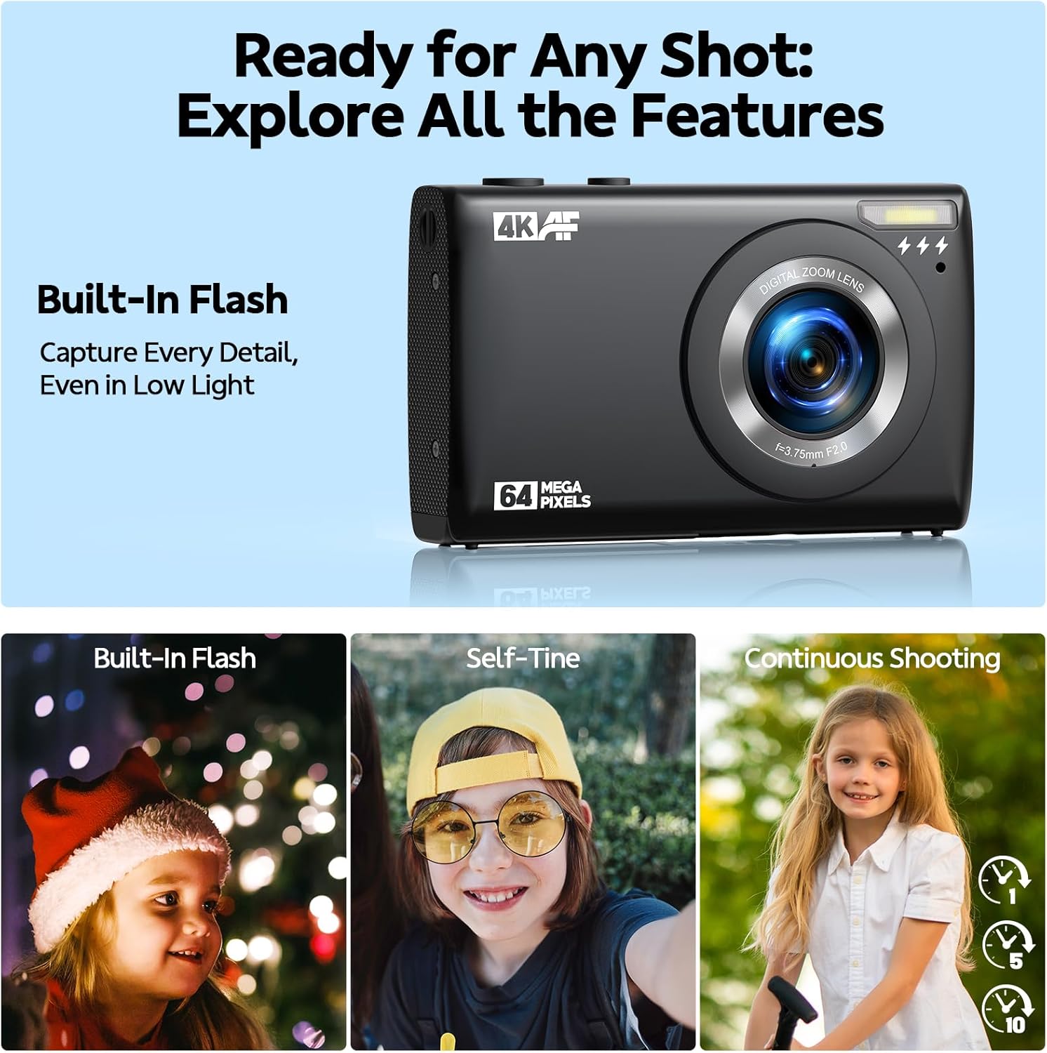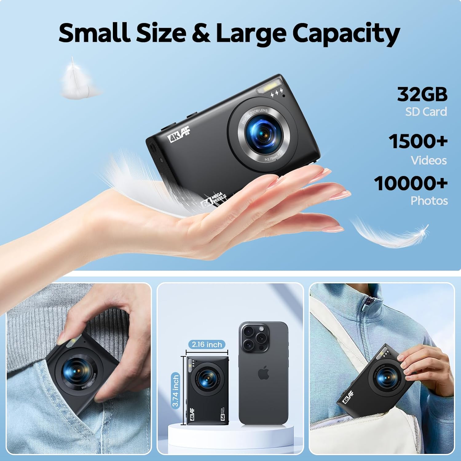 【32GB Card and 2 Batteries】: This compact digital camera 4K contains 2 rechargeable lithium batteries which can be charged for the children’s camera via a USB cable. After fully charged, it can shoot continuously for 3-4 hours, reducing the time for frequent charging during travel; Package includes: 1*Children’s digital camera, 2*Rechargeable batteries, 1*32GB card, 1*Lanyard, 1*USB data cable, 1*User manual