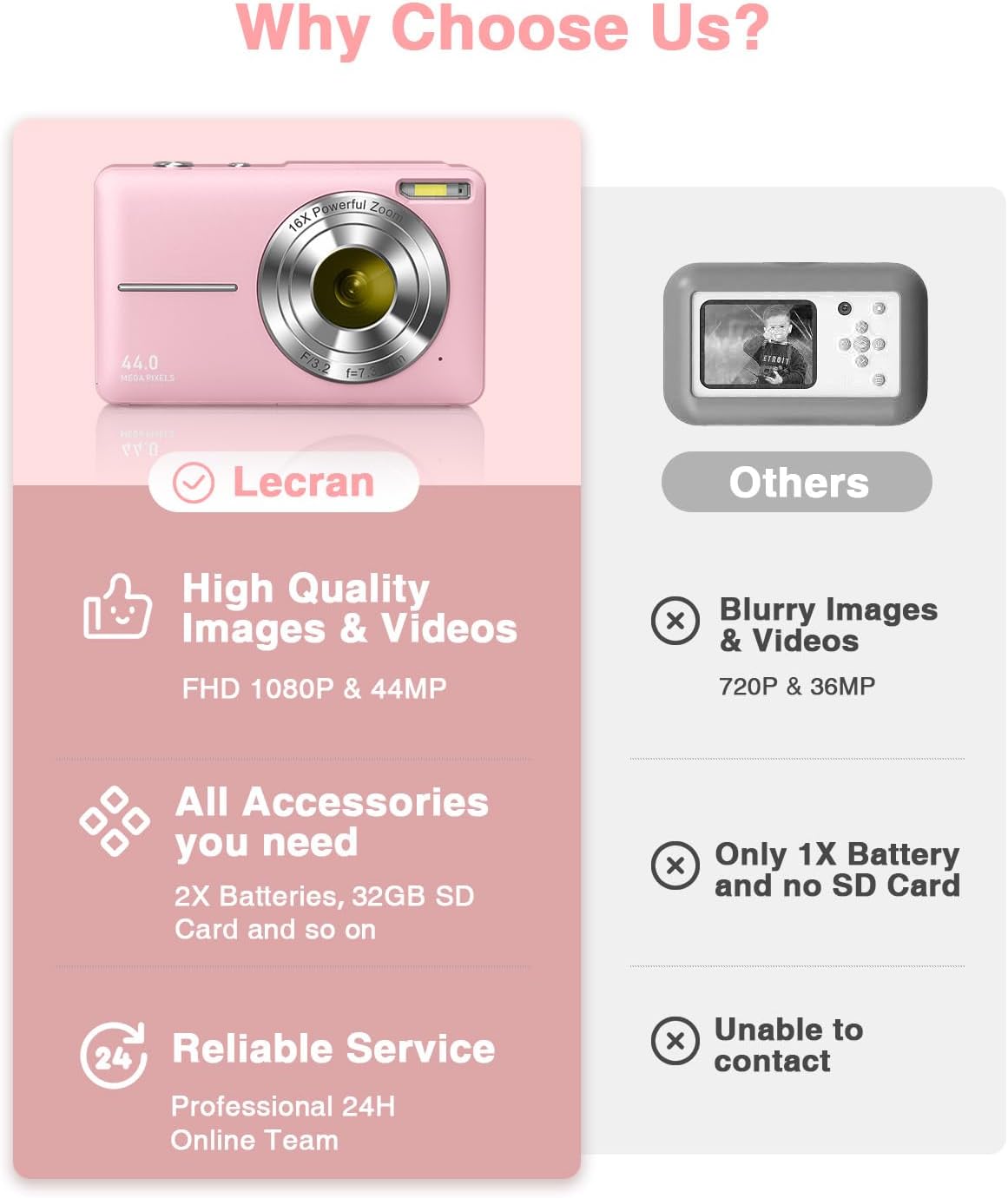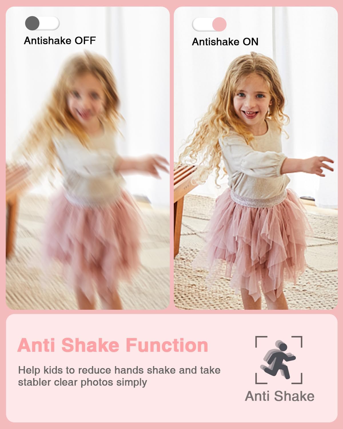 Meaningful Gift – This pink digital camera for kids is equipped with a high-level CMOS Sensor and anti-shake function, which helps to capture vivid clear 44MP Images and record stable smooth FHD 1080P resolution videos. It’s a meaningful Christmas or birthday gift camera for kids to cultivate their interest in photography, experience the lovely life, and leave funny memorable moments with family or friends.