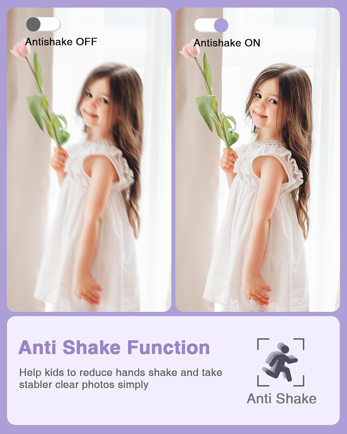Meaningful Gift – This purple digital camera for kids is equipped with a high-level CMOS Sensor and anti-shake function, which helps to capture vivid clear 44MP Images and record stable smooth FHD 1080P resolution videos. It’s a meaningful Christmas or birthday gift camera for kids to cultivate their interest in photography, experience the lovely life, and leave funny memorable moments with family or friends.