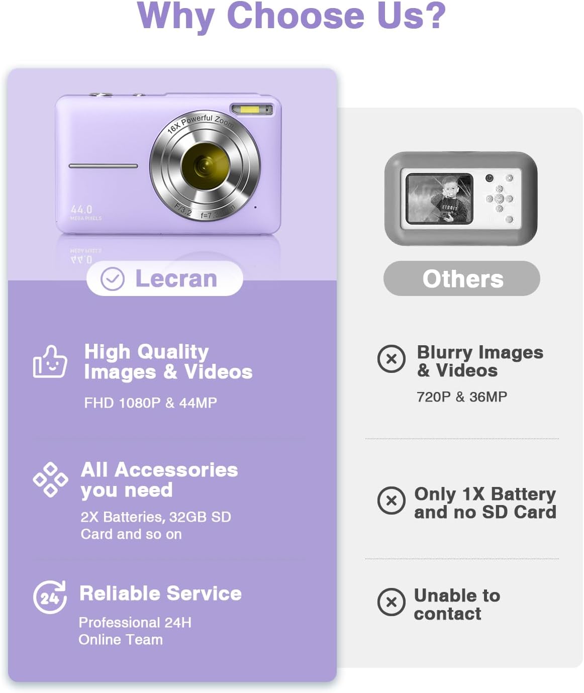 Be the first to review “Digital Camera, FHD 1080P Kids Camera with 32GB Card, 2 Batteries, Lanyard, 44MP 16X Zoom Anti Shake, Compact Portable Point Shoot Mini Camera for Kids Teens Students Children Girls Boys(Purple)”