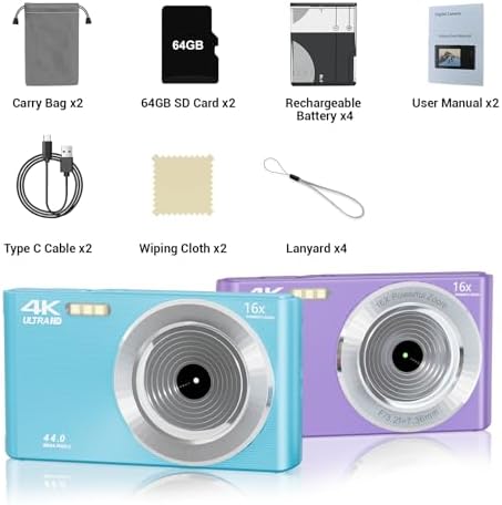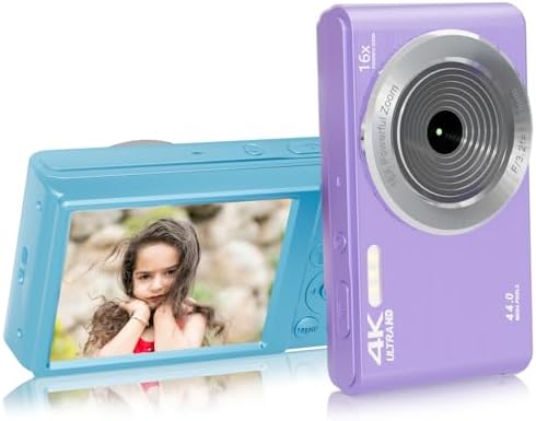 Purle & Blue Digital Camera for Teens, FHD 4K 44MP Digital Camera Purple with 64GB SD Card 16X Digital Zoom, Cameras for Photography Compact Point and Shoot Camera for Teen Boys Girls Kids Camera Digital