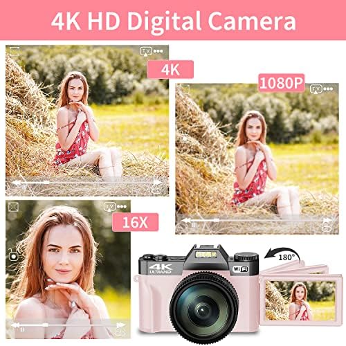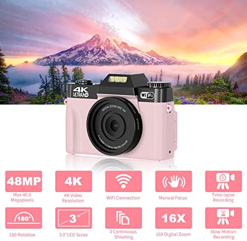📸【Camera for Photoggraphy and Video】The digital camera featuring 4K video and 48MP photo resolution, the vlogging camera supports 16X Digital Zoom, Video Pause, Recording while Charging, Loop Recording, Continuous Shooting, Silent Recording, Self-Timer. with the latest upgraded chip to ensure the camcorder images more high-definition, more realistic. It’s the best gift for friends and family.