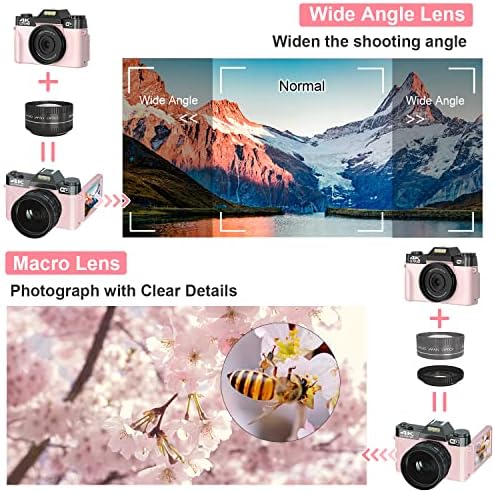 📸【Digital Camera with Wide Angle Lens & Macro Lens】This digital camera equipped the camera with a professional detachable 52mm wide angle lens with macro lens, so the camera is great for capturing wide horizons easily, and macro lenses capture the diversity of the tiny world. Sharp 4K photos can be ruled out with manual focus. With a knob on the top of the camera, you can switch between photos, video, time-lapse photography and other features.