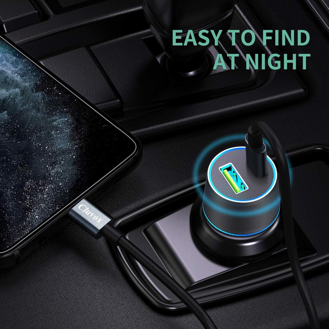 Easy to Find at Night: Fast charging car charger combine circular soft blue LED light and Multi-annular design of appearance, easy to find and use at night