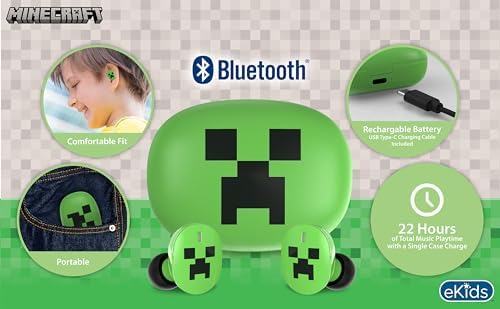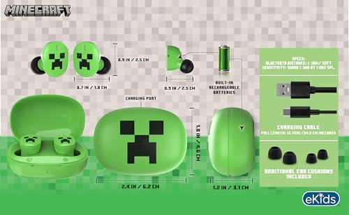 Minecraft Design: Featuring green Minecraft graphics and matching charging case, these Bluetooth earphones have an ergonomic shape that provides lasting comfort. Includes rubber ear cushions in 3 sizes: small, medium, and large.